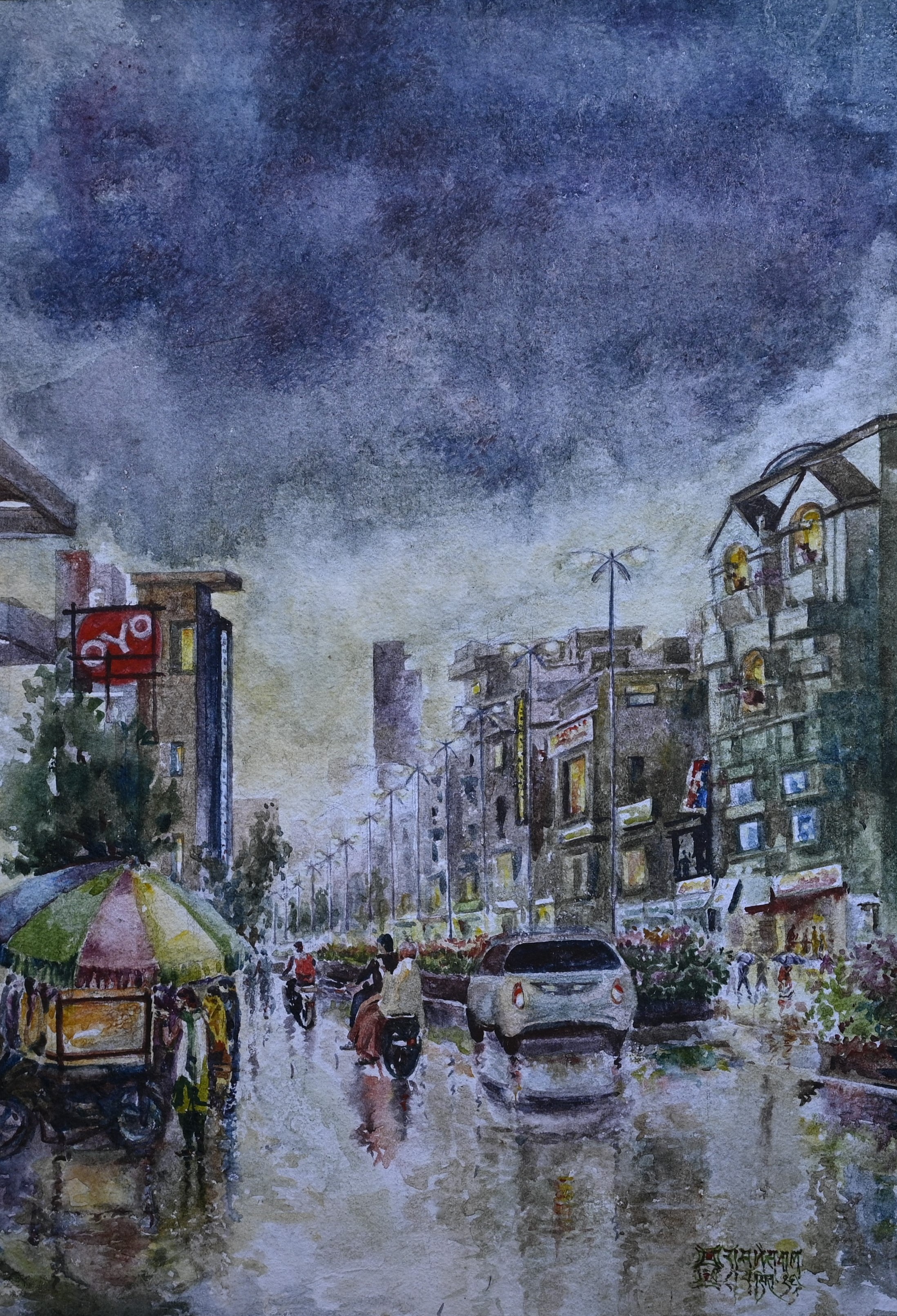 This image is a beautiful watercolor painting depicting an urban street scene during or after rainfall. The wet road reflects the vehicles and people, adding depth and realism. The sky is painted in dark, stormy shades of blue and grey, suggesting an overcast or rainy atmosphere. On the left side, there is a street vendor's cart with a multi-colored umbrella, and a few people are gathered around it. Several motorbikes and a car are visible, moving or parked along the street. Buildings on both sides of the road are illustrated with warm, glowing windows, suggesting that it's either evening or early night. Street lamps line the road, adding to the urban ambiance. The overall mood of the painting is calm yet dynamic, capturing a moment in city life where nature and human activity intersect. The artist's signature is visible in the bottom right corner, adding a personal touch. The use of muted color and reflections creates a poetic and atmospheric scene, blending realism with artistic expression.