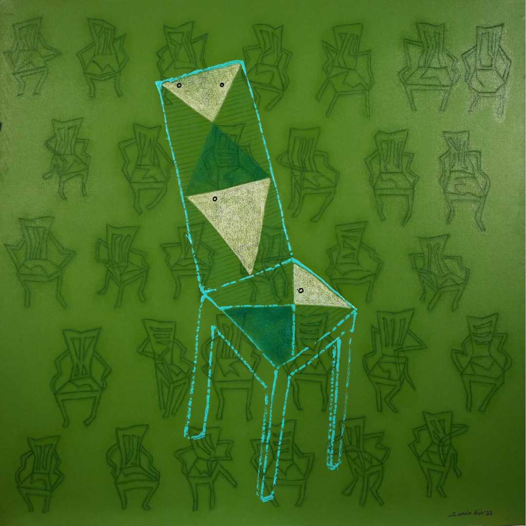 This abstract painting by Samir Aich features a dark olive green background with a large, stylized teal chair at its center. The chair is not drawn realistically—it has sharp, angular lines and a geometric, almost cubist look, with a light beige triangle in its backrest. The brushstrokes give it a textured feel. Around the main chair, many smaller, sketch-like chairs are drawn in dark charcoal green. These appear faint and ghost-like, spread across the canvas in a loose pattern. The contrast between the bold central chair and the faded ones creates depth and draws attention. The painting gives a quiet, thoughtful feeling, as if the main chair represents something important or unique among many. The work is signed “Samir Aich” in the corner.