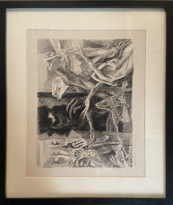 The work is mounted in a dark wooden frame, paired with a light-coloured mat, and reflects a modern, expressionistic sensibility rooted in printmaking traditions.
