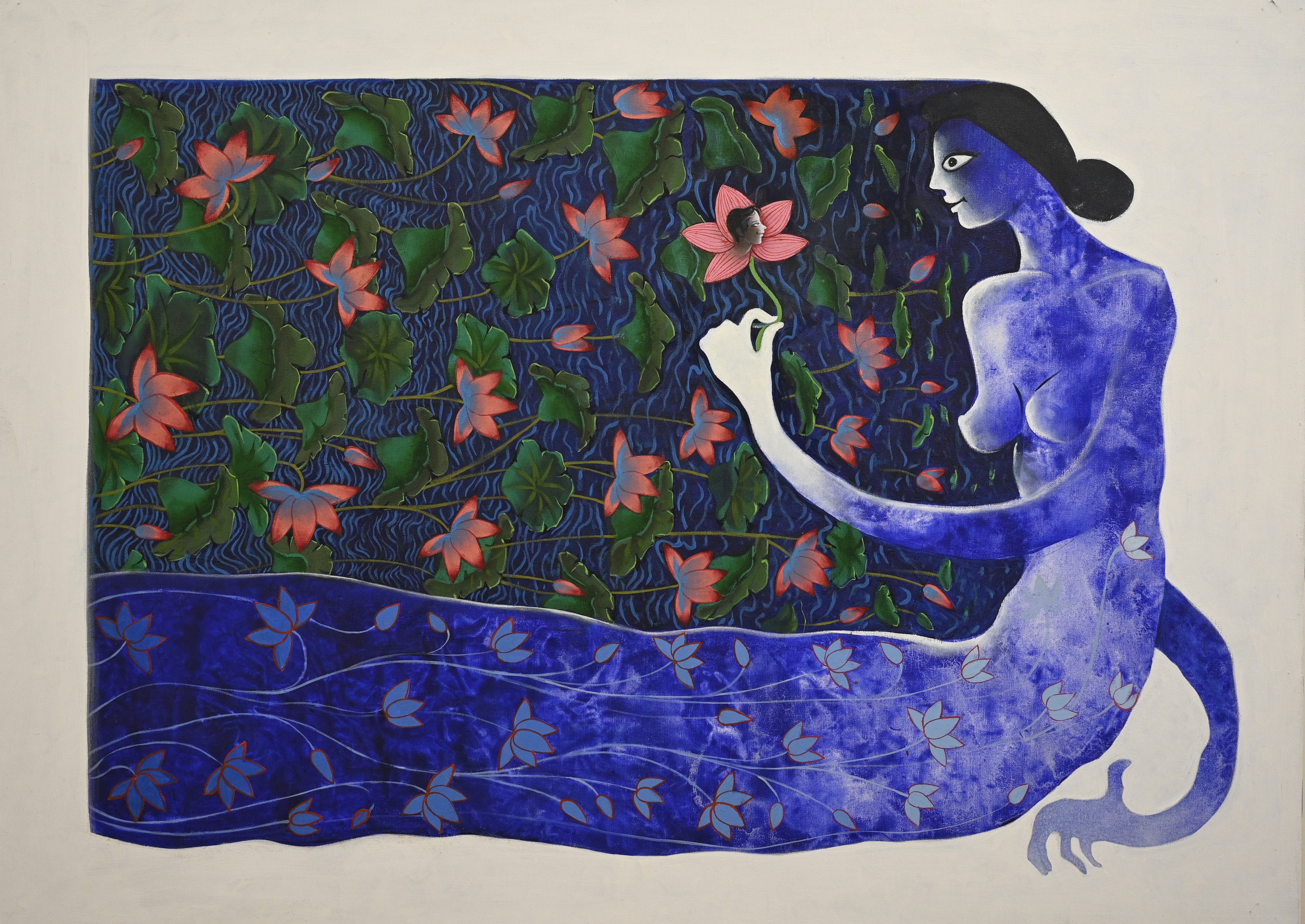 The painting depicts a stylized female figure, rendered in shades of deep blue, almost ethereal in appearance. She is depicted bending over, her body flowing gracefully, reminiscent of a flowing robe or perhaps water itself. Her form interacts with a densely populated field of lotus flowers in a contrasting yet harmonious palette. The lotuses are primarily coral pink and red, with green lily pads and dark blue water suggesting a pond. Along the figure's right side, a second field of lighter blue lotuses appears, almost like a continuation of the figure's form. The color blue dominates the overall composition, creating a serene and slightly melancholic mood. The style is reminiscent of modern illustrative painting with a touch of folk art in its depiction of floral motifs. The background is a plain off-white, contrasting the rich colours of the main subject matter. The woman’s hand gently holds a single lotus flower, creating a focal point of intimacy and connection. The painting's overall mood is one of contemplation and peace, with nature playing a central role.