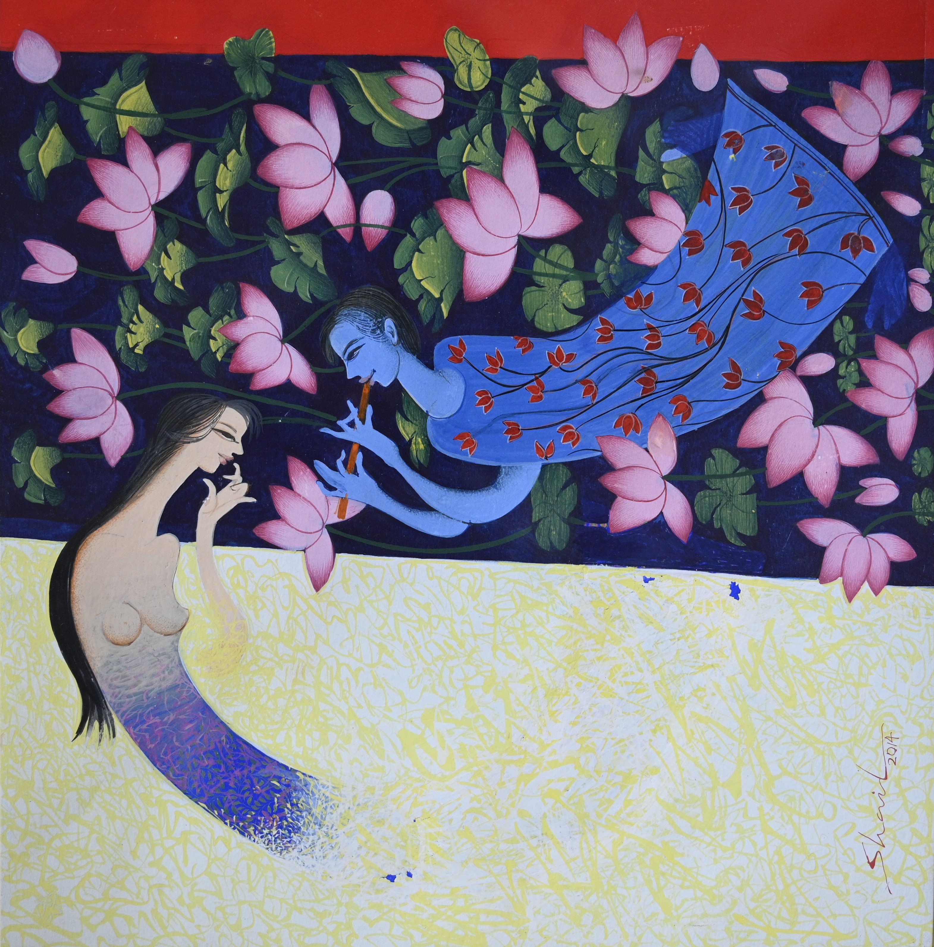 This painting features two figures, a man and a woman, portrayed as a romantic or spiritual couple within a vibrant lotus garden. The man, positioned in the upper-right, has blue skin and wears a flowing, patterned blue garment while playing a flute. The woman, in the lower-left, is depicted in muted tones with attire suggesting gentle movement, both floating above a light-yellow band that separates them from the lush lotus pond. The pond dominates the upper half, filled with pink lotus blossoms and leaves in shades of pink, purple, and green. The composition emphasizes their serene interaction, framed by the vibrant floral setting. The style blends traditional Indian painting techniques with a folk-art sensibility, focusing on mood over photorealism. The colors are bright and expressive, particularly in the detailed floral elements. The overall lighting evokes a peaceful, meditative atmosphere, highlighting harmony between the figures. The yellow band acts as a neutral zone, balancing the vividness of the lotus pond and the figures above. The painting conveys a sense of tranquility and spiritual connection.