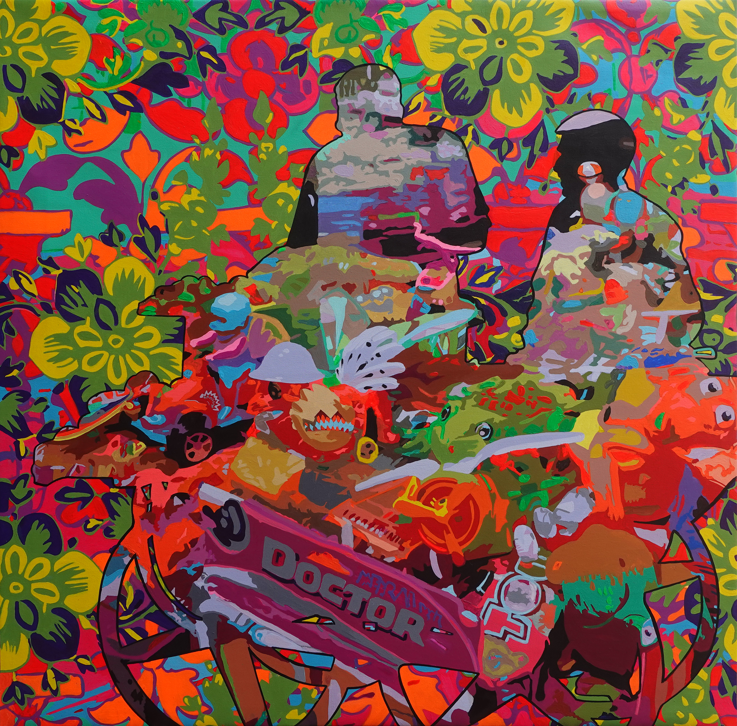 A vibrant, colorful painting features a collage-style composition. A multitude of images and shapes, including toy cars, plastic animals, and figures of people, are layered and overlaid. The silhouettes of two men are prominent, seemingly interacting with or within the jumble of objects. A large, stylized word, "DOCTOR," is visible in a pinkish-purple font, appearing on a compartmentalized section of the artwork. The background is a dense pattern of large flowers in various colors, including reds, greens, yellows, and purples, on a teal-coloured backdrop.The artwork conveys a sense of dynamic disorder, filled with vibrant hues and a densely layered visual rhythm. The colours are highly saturated and the style is reminiscent of a pop art or graphic novel.