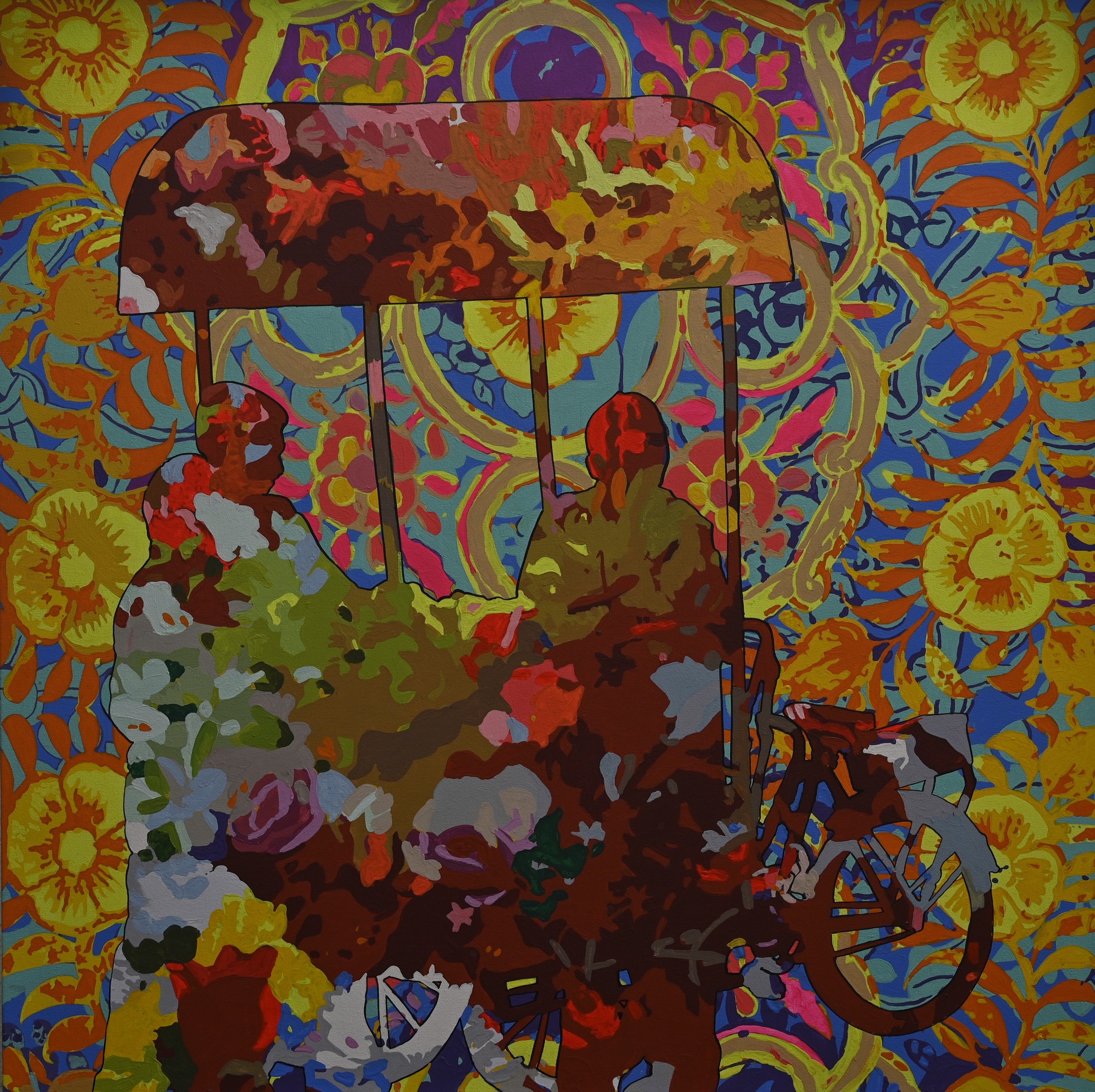 The artwork centres around a rickshaw, depicted in a semi-abstract manner where the figures of the driver and passengers are only suggested, their forms merging subtly with the background pattern. The vehicle itself is rendered almost like a dark silhouette, creating a striking focal point. Surrounding this central figure is a bold, richly coloured floral pattern that dominates the background, featuring repeating motifs of stylized flowers in vibrant shades of orange, yellow, pink, and teal set against a deep blue base. This intricate design evokes the feel of traditional textile patterns, adding a layer of cultural texture to the piece. The color palette is highly saturated and contrasting, with warm hues of orange and yellow playing off the cool blues and teals, lending the painting a lively and dynamic energy. Stylistically, the work draws from Pop Art through its use of simplified forms and bold colours, while also echoing folk art or traditional textile designs in its patterned background. This fusion creates a playful yet culturally resonant piece. Overall, the painting blends an urban scene—the rickshaw as a symbol of daily life—with a decorative, culturally rich motif, producing an impression of vibrant energy and a strong sense of cultural identity