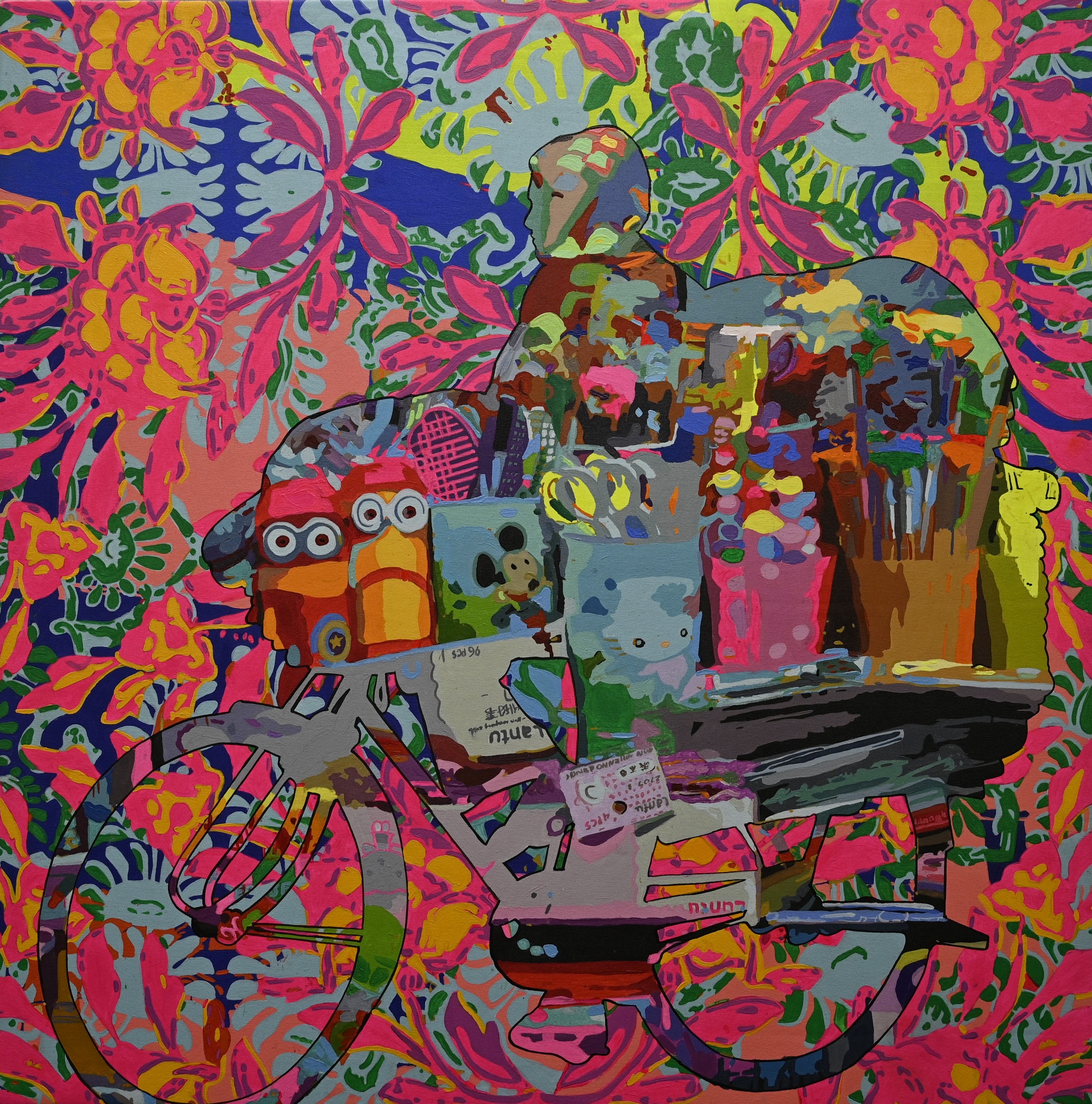 A vibrant, abstract painting. A stylized silhouette of a person riding a bicycle is superimposed on a richly patterned background. The background pattern is dense with a mixture of floral and abstract designs in various shades of pink, magenta, yellow, and teal, set against a backdrop of deeper blues and greens. The bicycle silhouette is a dark outline, and within its frame, numerous small, colourful images and objects are visually layered and assembled—seemingly collected items like stationery, flowers in pots, children's toys, and other miscellaneous objects, creating a collage effect. These details are painted in a variety of colours, further intensifying the pattern and bright colours of the background.