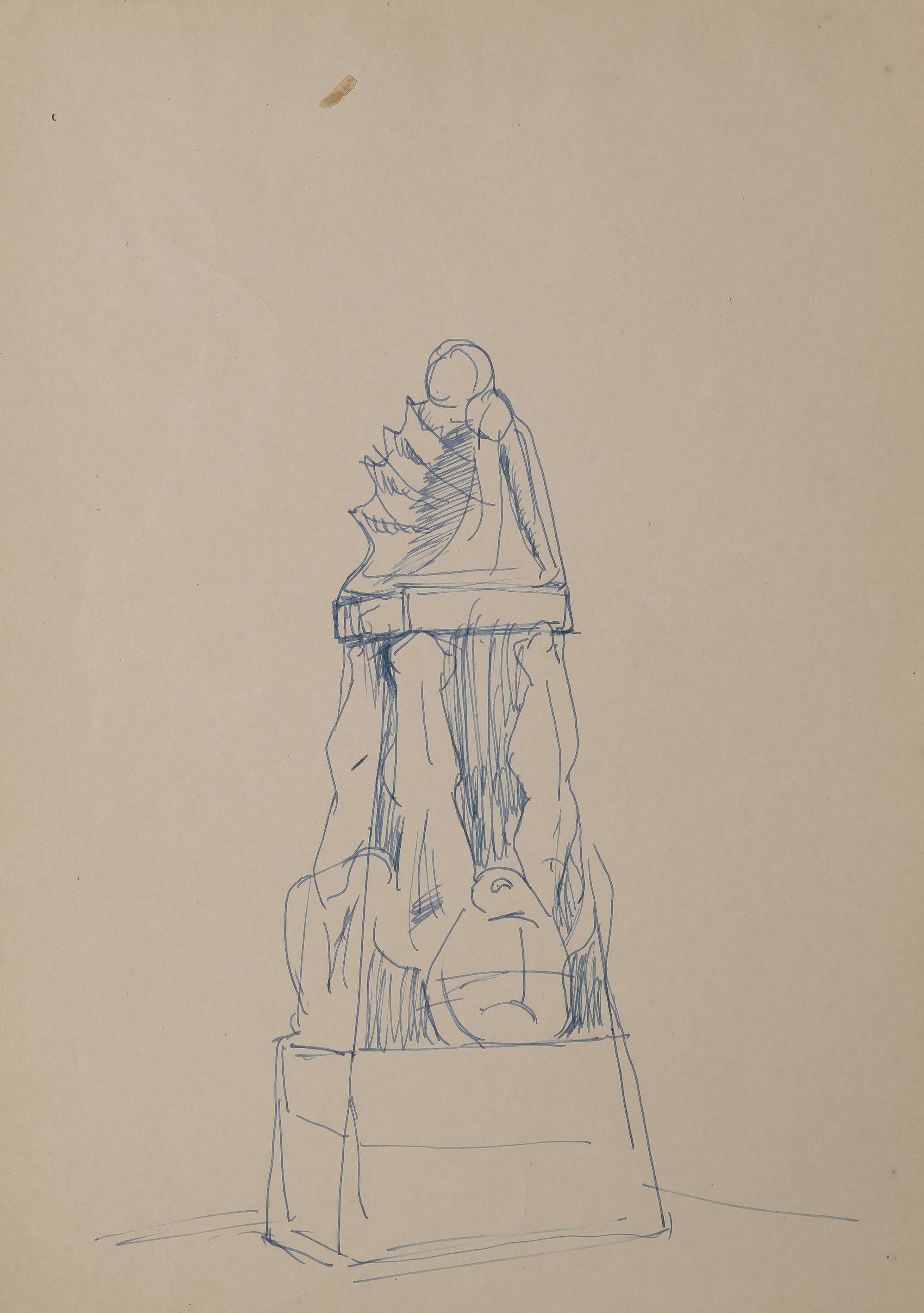 This drawing carries a quiet solemnity, almost reverent in tone. The monument-like structure exudes a sense of permanence and ritual, as though it is a marker of memory or devotion. There is restraint in the line work, yet the verticality gives it dignity and presence. The piece feels contemplative—an offering of respect, where the layered, almost organic shapes suggest both strength and fragility, as if holding history and spirit within their form.