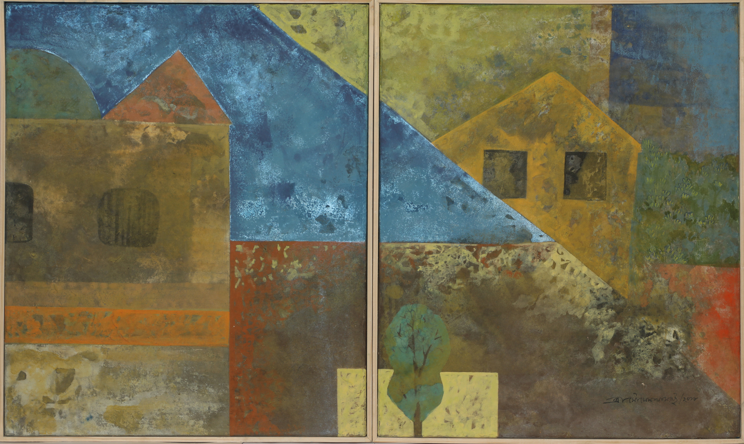 In this vibrant and rhythmically composed diptych, Khamrui moves towards a more colorful and symbolic abstraction of the landscape. Trees, roofs, and sky interlock through a network of intersecting planes and blocks of color. Earthy reds, lush greens, vivid blues, and creamy whites create a dynamic yet balanced harmony. The forms appear simplified, but they echo real structures and terrains, possibly inspired by rural Bengal. This painting exemplifies the artist’s lifelong interest in nature’s complexity and his ability to distill it into geometric, lyrical compositions
