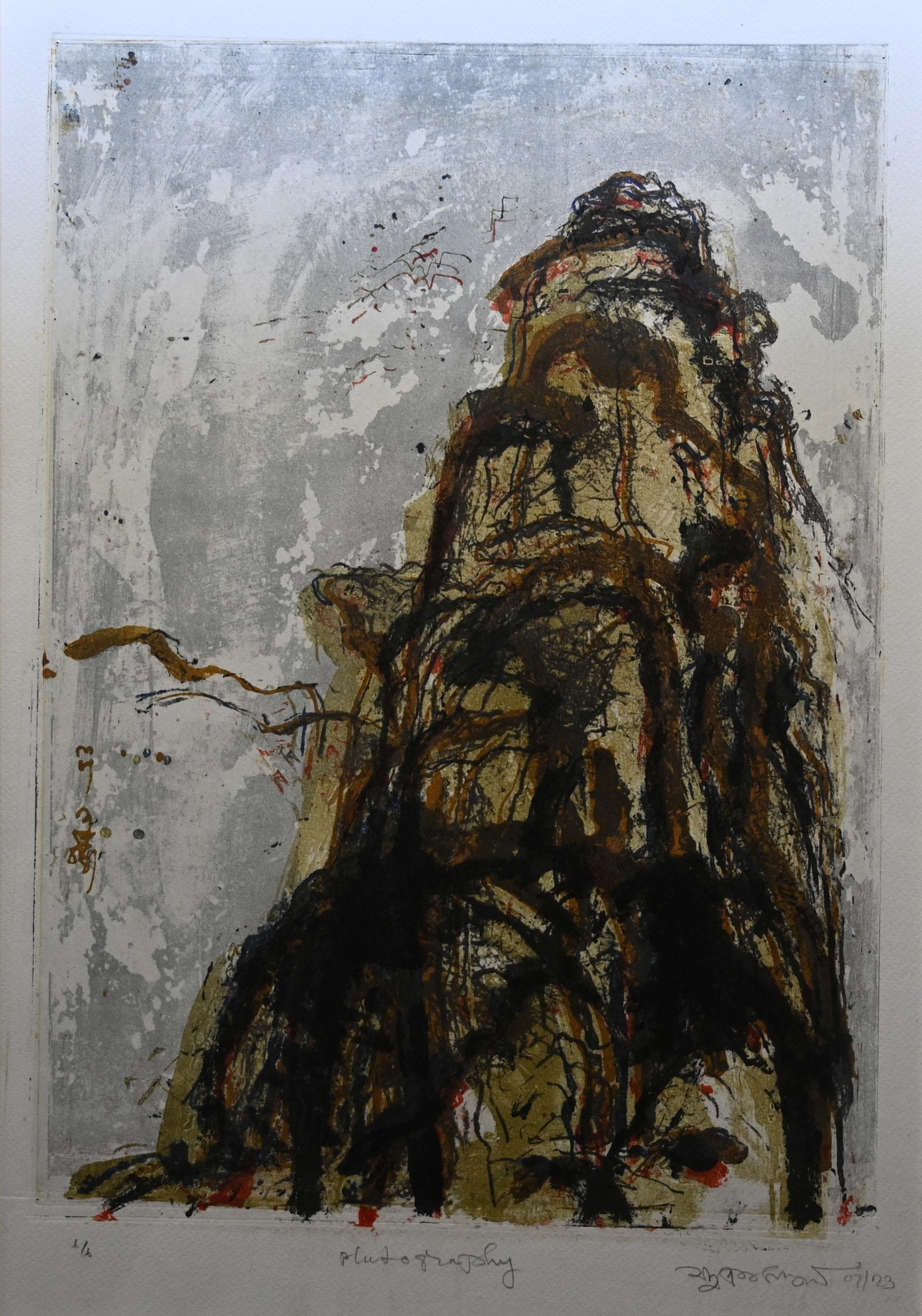 This image is an abstract artwork that appears to depict a towering, organic structure resembling a tree or a rocky formation. The dominant colours are dark browns and blacks with hints of red, giving the piece a rugged and intense feel. The background is textured with muted grey and off-white shades, creating a stark contrast with the darker central figure. The composition includes chaotic, sweeping lines and splatters, adding a sense of movement and raw energy. There is small, scattered red dots that add depth and visual interest. The lower edge of the artwork contains handwritten text, including what looks like the title "plutography," a signature, and the date "07/23." The style suggests a blend of expressive, gestural strokes and layered textures, evoking a sense of nature’s untamed power and complexity. Overall, the piece combines abstraction with a hint of natural forms, inviting viewers to interpret its meaning and emotional impact.