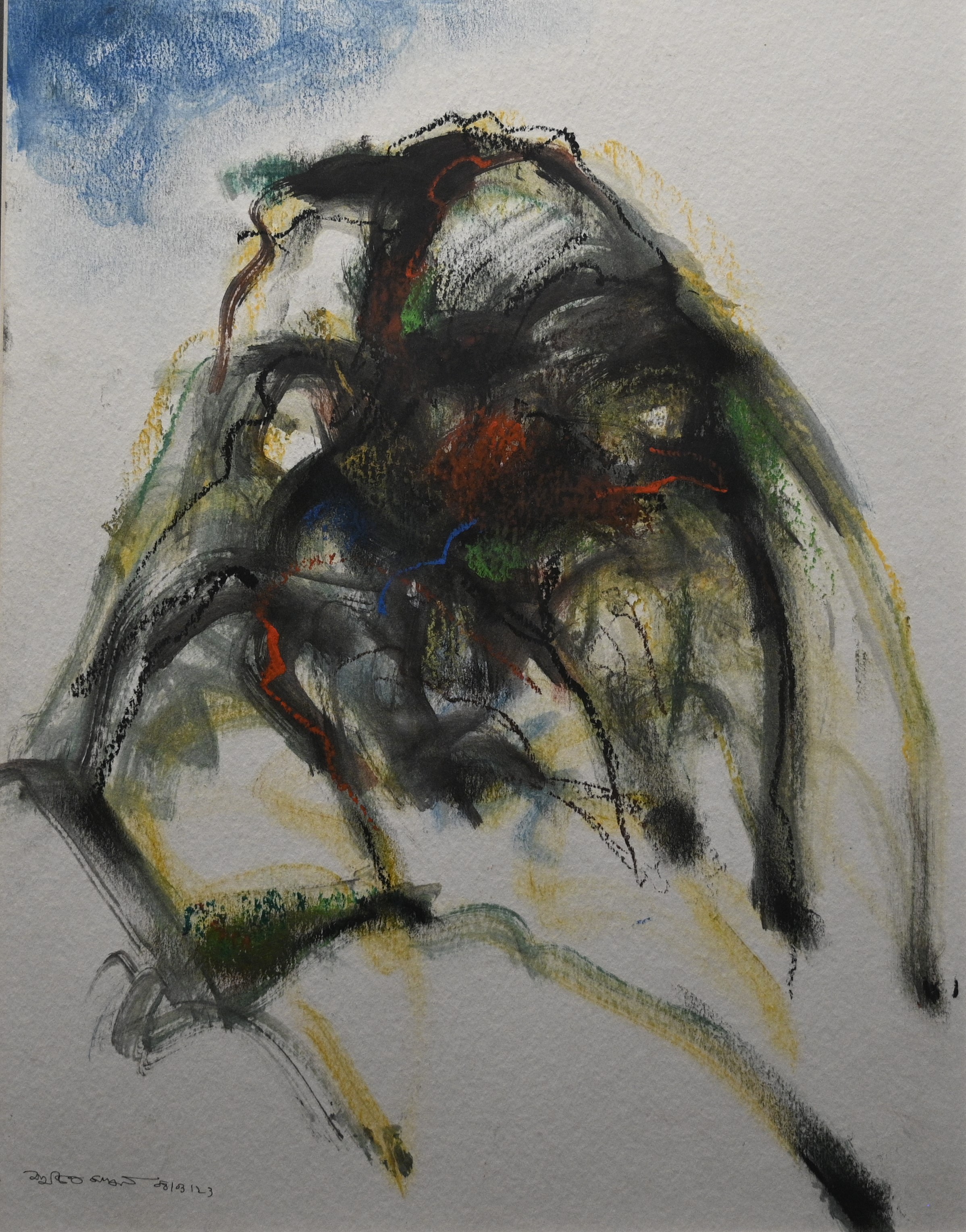 The brushstrokes and marks are varied—some fluid and smoky, others rough and jagged—contributing to a raw, almost eruptive feeling. There’s a sense of motion within the mountain itself, as though it’s alive or in the process of forming. Yellow lines arch around the base and sides, giving an impression of light, heat, or movement across the surface.