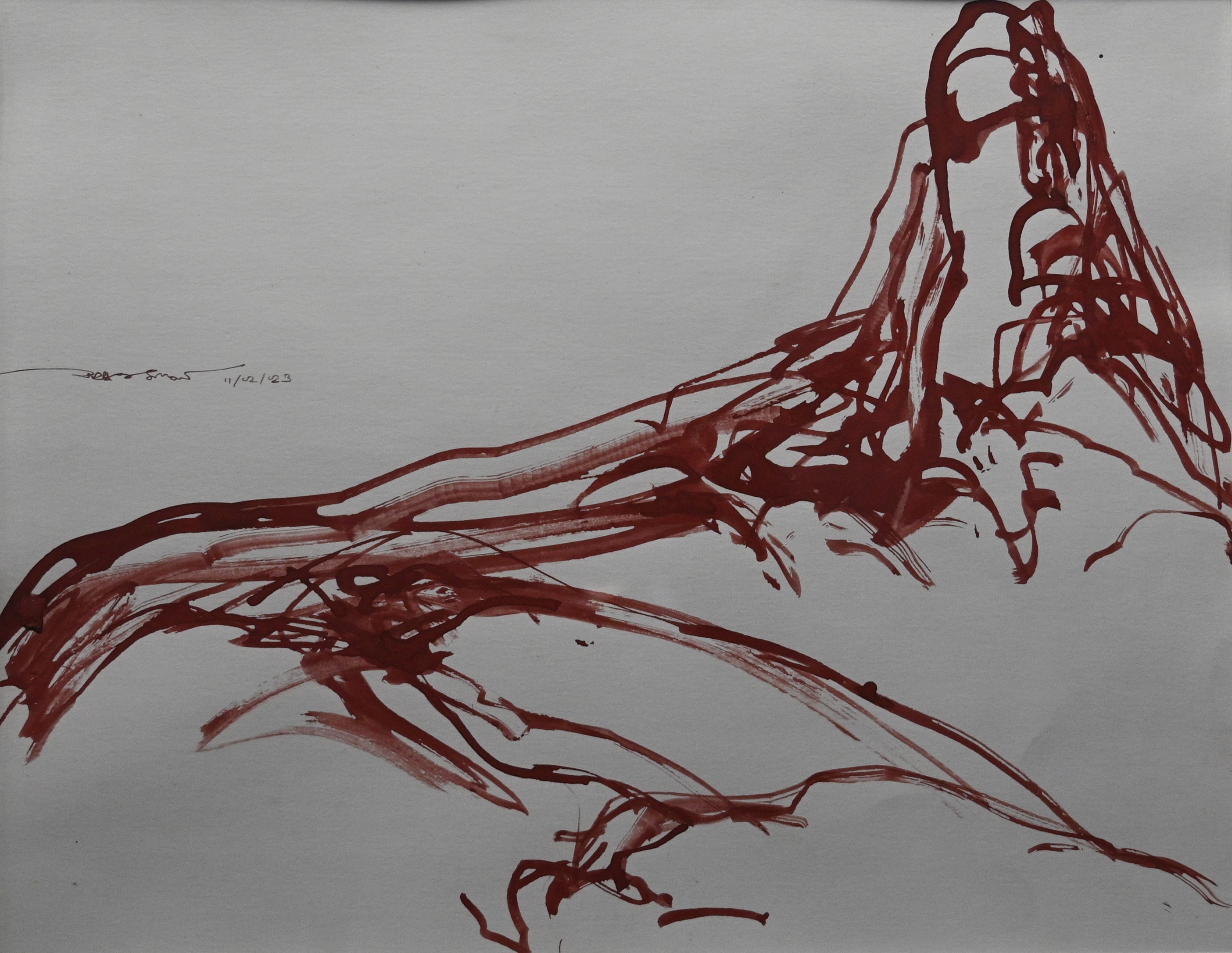 The artist’s use of negative space is striking — much of the paper is left blank, allowing the eye to focus on the motion and structure of the red forms. The brushwork is loose yet deliberate, capturing a raw sense of energy and movement that mimics the geological forces shaping such landscapes. The layered lines and varied pressure of strokes suggest both contour and shadow, though in an abstract, almost calligraphic way.