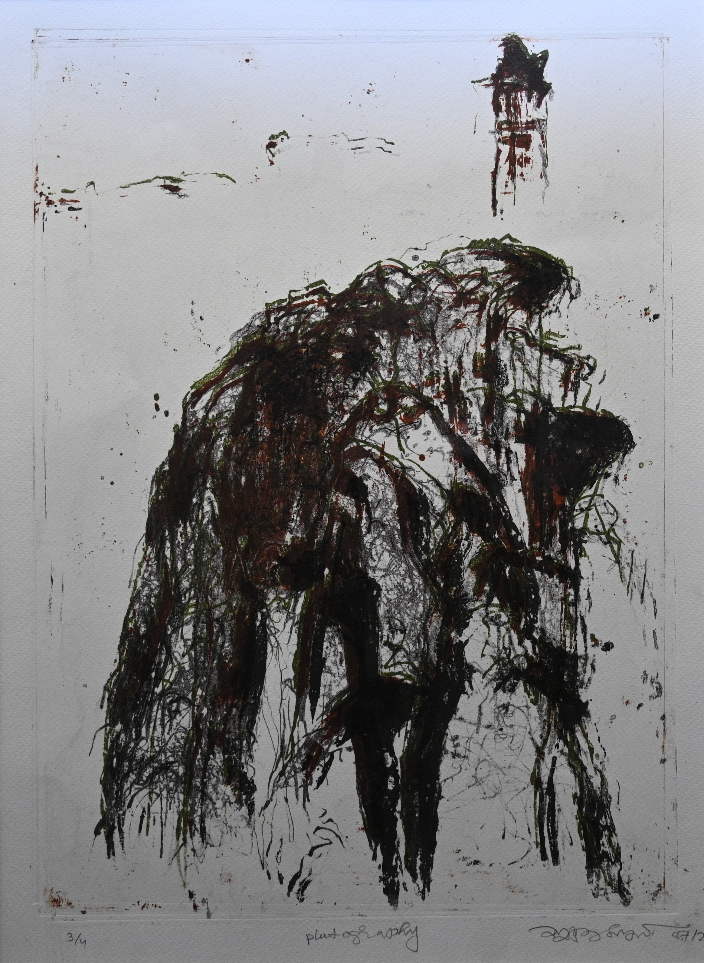 This artwork, titled "Plant of Gravity", is a highly textured and emotionally evocative piece. The work seems to be a mixed-media print or monotype, numbered 3/4 in the edition, combining abstract elements with suggestions of natural form.