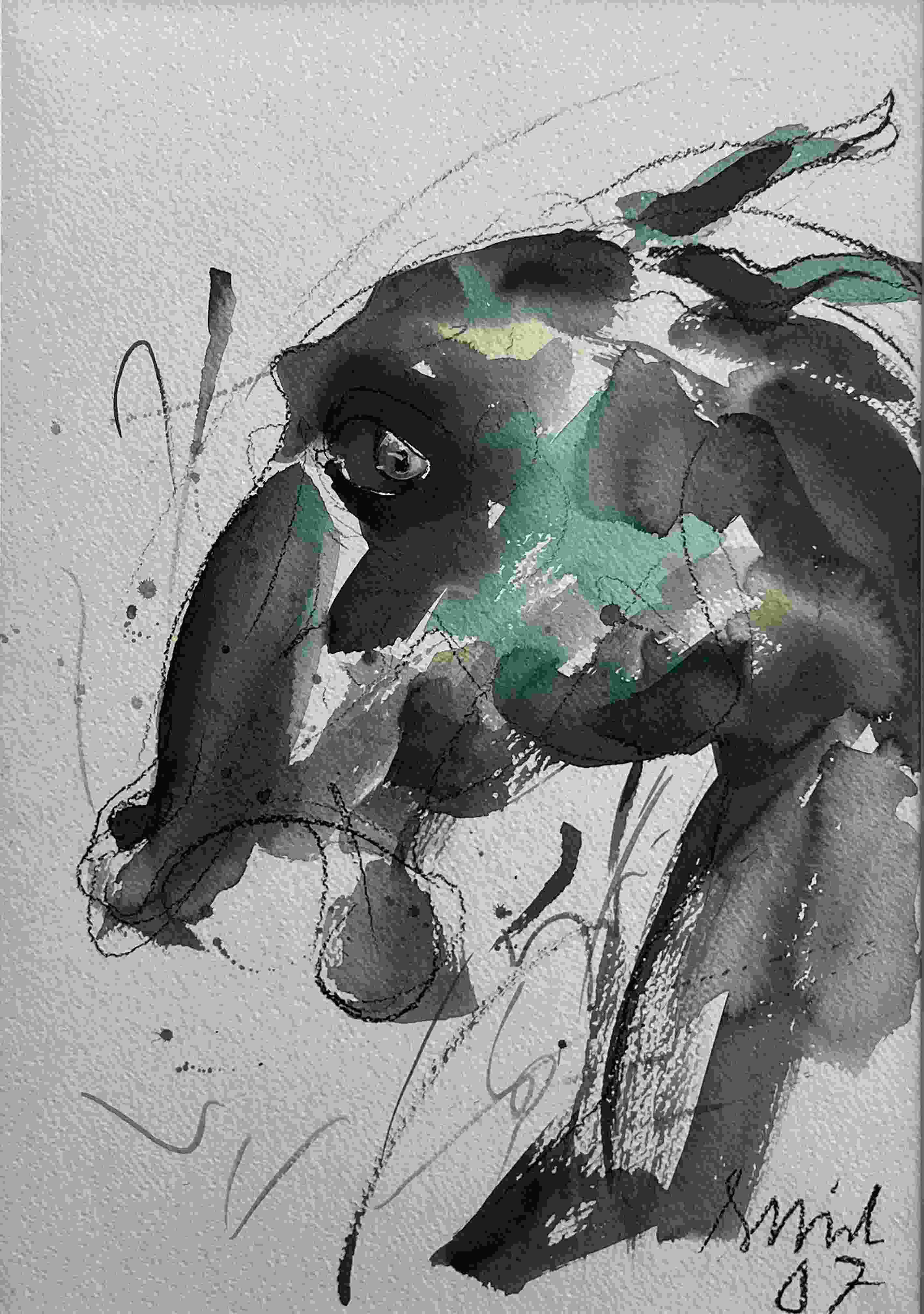 A detailed watercolor and ink illustration captures the horse’s head and neck in close view. The horse's head is depicted in shades of dark grey, teal, and muted greens and browns. The artist's technique uses visible brushstrokes and layers of color, creating a sense of movement and dynamism. There are also various ink lines and marks scattered across the piece, suggesting additional details of the form or a sense of energy. Sections of the background reveal a softer greyish off-white tone.