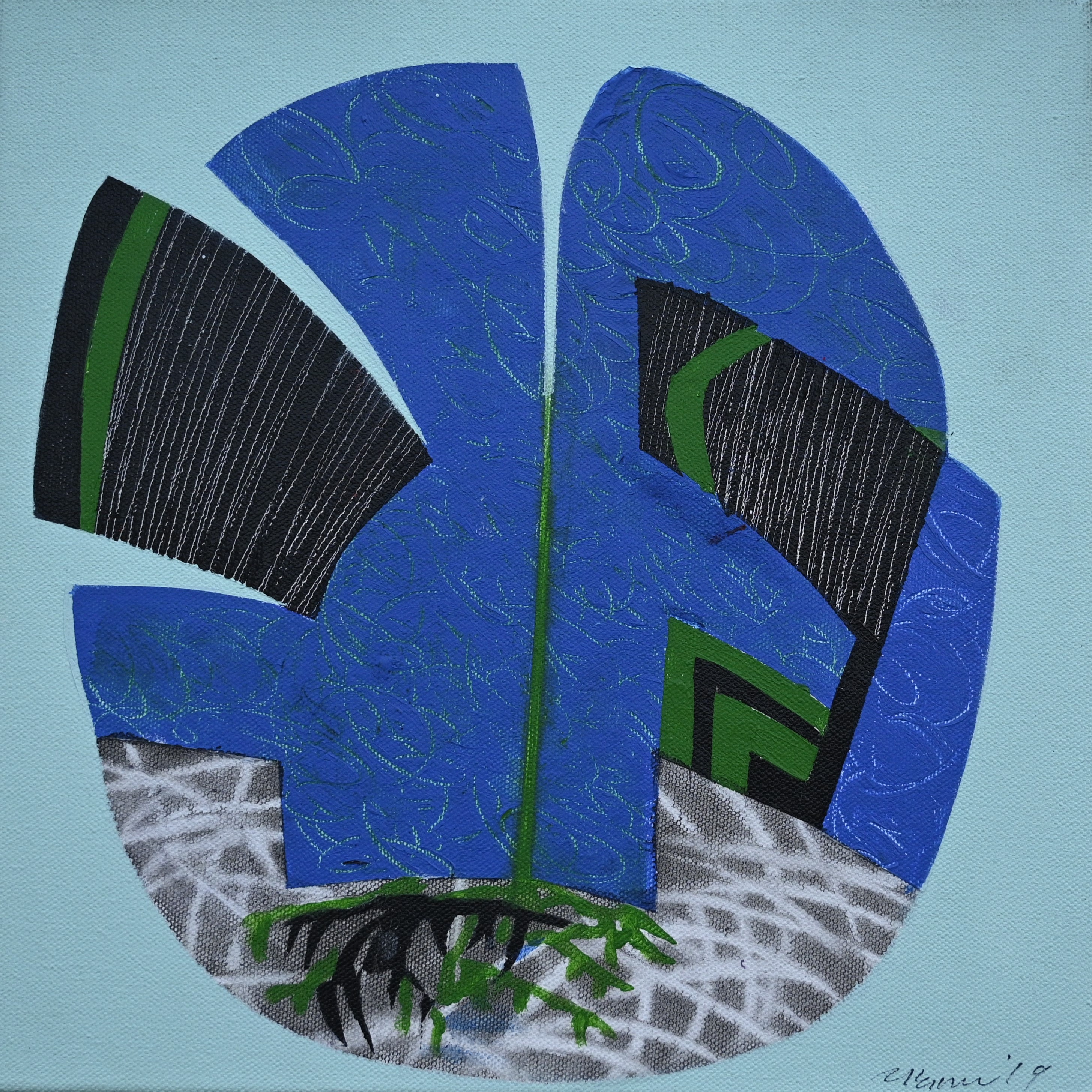 This artwork is a modern abstract painting with a composition centred around an oval shape. The background is a light, pastel blue that provides a calm, neutral backdrop. Inside the oval, bold patches of blue dominate, featuring intricate swirling patterns in green, adding a layer of texture and depth. Intersecting these blue patches are geometric shapes in black with fine, white linear details, and some areas incorporate green accents, creating a contrast with the dominant blue tones. Near the bottom, there's a grey section with a web-like white pattern, adding an organic feel. The composition overall suggests movement and layered complexity, perhaps symbolizing growth or connectivity. The green vertical line in the centre could represent a stem or axis, anchoring the forms around it. The painting is signed "E. Mauri '19" in the bottom right corner, indicating the artist and year. The piece skilfully combines sharp geometry with organic motifs, resulting in a balanced yet dynamic abstract work.