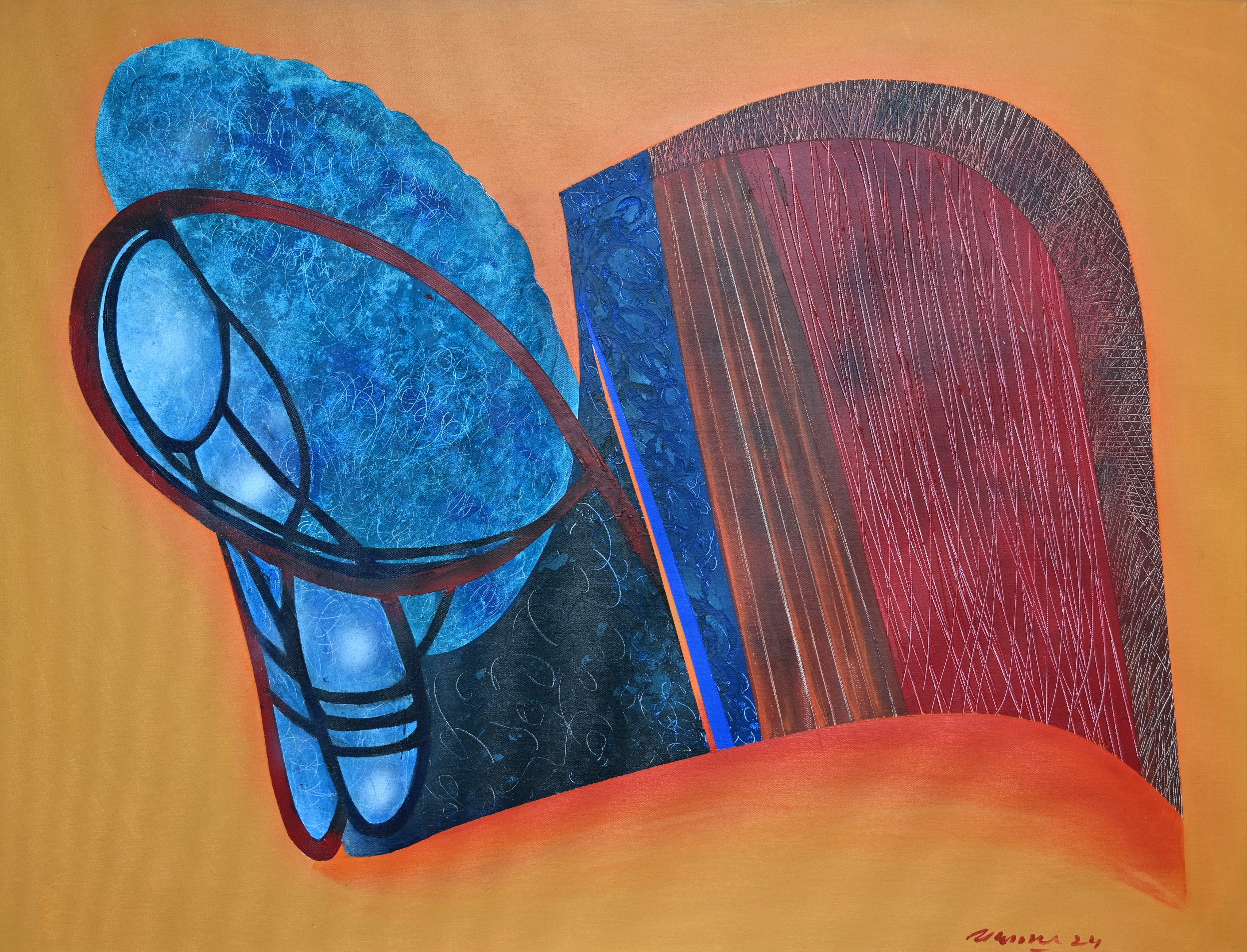 A large abstract painting on canvas is presented. The canvas's background is a muted, warm orange-yellow color. A central, complex, organic shape dominates the composition. This shape is constructed with layers of dark blues, dark reds, and various shades of brown. The colours are applied with a textured, almost granular effect, giving a sense of depth and varied surface textures. Within the main form, there are areas that evoke the appearance of stained-glass windows with light blue and pale white segments within dark, almost black, outlines or frames. The overall impression is one of dynamism and a layered, almost three-dimensional quality, though the subject is non-representational. A signature or artist's mark is visible at the bottom right corner.