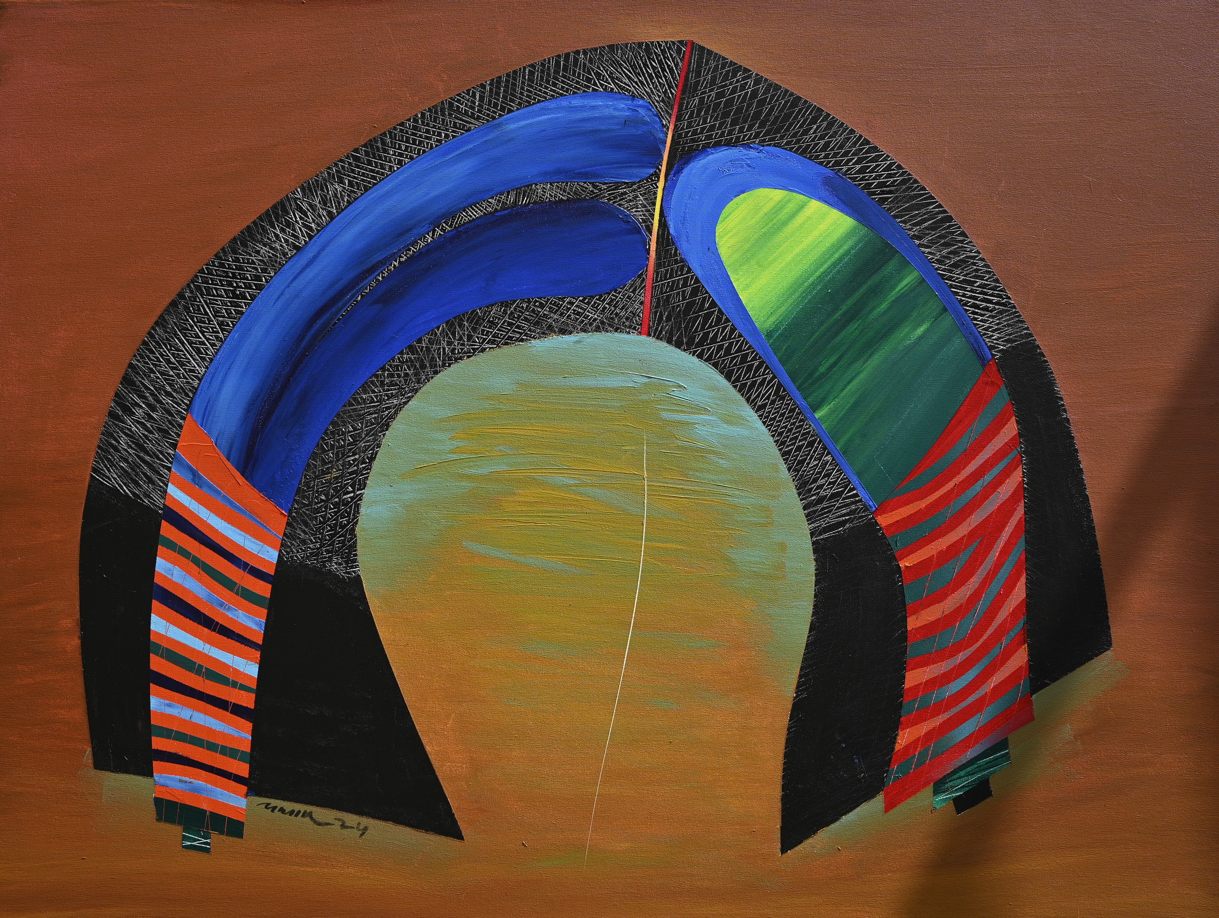 The arch rests against a pale lime-green background that contrasts sharply with the saturated colours of the arch, providing a stable foundation for the dynamic foreground. The textured surface suggests acrylic on canvas. The artist’s signature is located in the upper right corner.