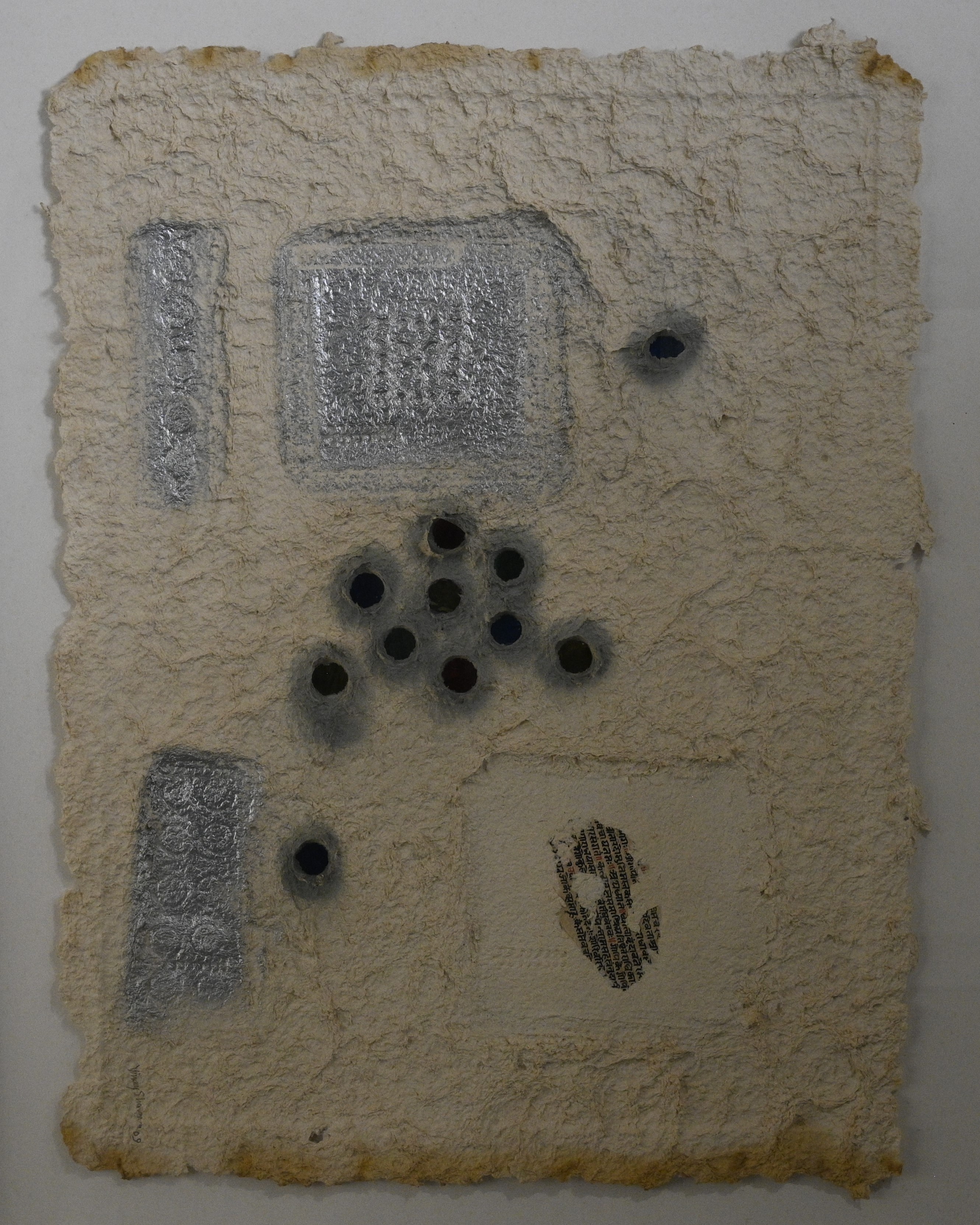 This artwork appears to be created on a textured, handmade paper with rough, uneven edges, giving it a raw and organic presence. The surface features abstract imprints and marks, primarily in muted grey and silver tones. Several circular perforations dominate the center, some filled with deep hues of black, blue, or red, creating a sense of voids or bullet holes. On the lower right, there is a faint rectangular frame containing a fragmented face rendered with text or script, suggesting memory, identity, or narrative embedded within the material. The metallic rectangular impressions on the sides resemble embossed textures, contrasting with the fragile and worn quality of the paper. Overall, the work evokes themes of erosion, scars, and imprints of time, blending fragility with permanence. It feels both archaeological and deeply personal, as though holding traces of forgotten histories or wounds.