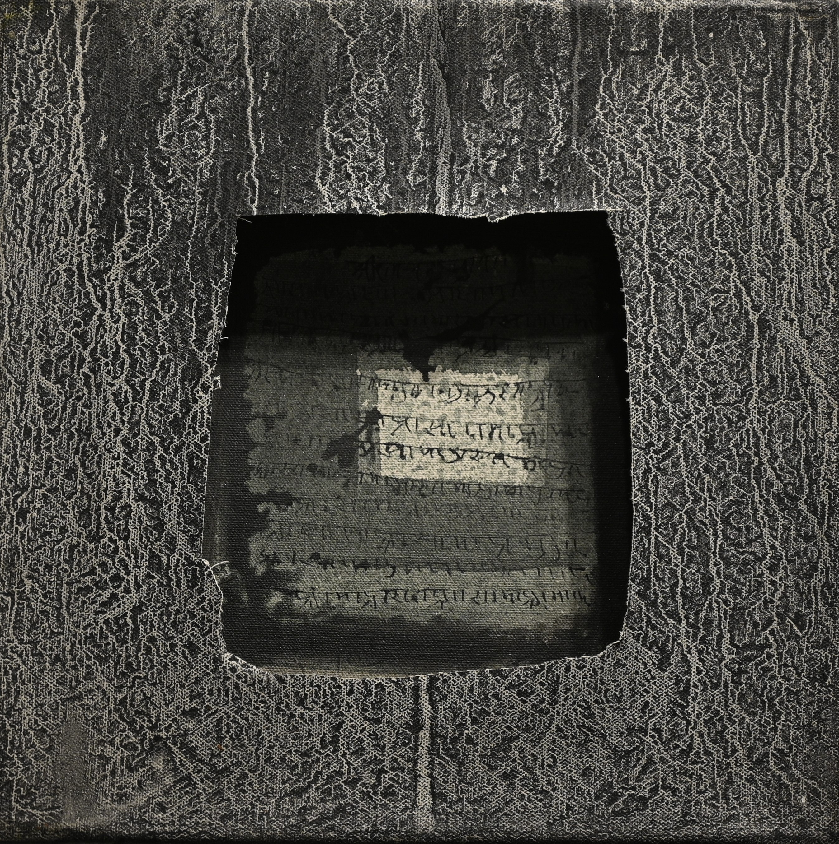 This image depicts a textured surface with an intricate, almost organic pattern resembling tree bark or a rough fabric weave in grayscale tones. At the center, there is a square cutout revealing a darker interior with faint, partially legible script or writing on a textured background. The script appears old and worn, suggesting it might be ancient text or a fragment of a manuscript. The cutout’s irregular, jagged edges contribute to an impression of wear, delicacy, and vulnerability. The contrast between the textured outer surface and the dark, mysterious interior creates a feeling of depth and intrigue. The lighting highlights the raised patterns on the outer surface, enhancing the tactile quality of the image. The overall mood is sombre and enigmatic, evoking curiosity about the hidden content behind the surface. The composition balances complexity with simplicity, focusing the viewer’s attention on the mysterious written fragment