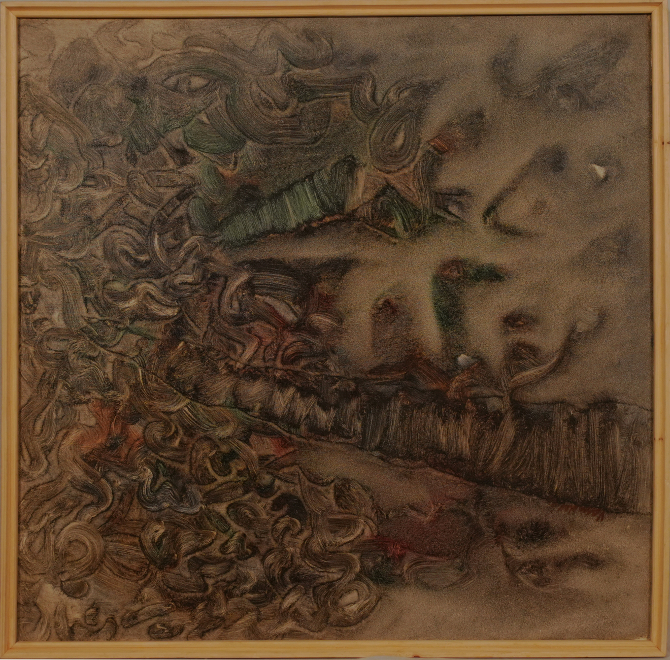 This oil painting by S.G. Vasudev is an abstract piece filled with swirling, textured brushstrokes in natural shades of brown, beige, and soft green. The way the paint is applied gives the artwork a feeling of depth and motion, as if something—maybe a figure or a landscape—is partly hidden in a stormy or shifting space. The painting feels mysterious and thoughtful, reflecting the artist’s interest in spiritual themes and human emotions. Since there are no clear shapes, viewers are encouraged to find their own meaning, connecting with the painting through personal feelings and imagination.