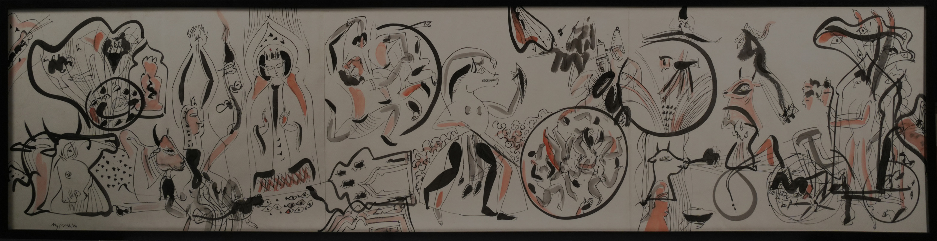 This artwork is a wide, playful painting done in ink and soft colors like yellow and black. It shows a lively scene filled with unusual human, animal, and fantasy figures moving together in a fun, dreamlike world. The characters are not drawn realistically — they are stretched, cartoon-like, and full of personality. Some look royal, others are just doing everyday things. Animals like horses and birds mix with people, and some creatures look part human, part animal. The background is light, making the figures stand out. Strange shapes like floating clouds and plants add to the magical feel. There’s no clear story or space, making everything feel like it’s happening at once. The painting feels busy, creative, and full of energy, letting people imagine their own meaning from it.