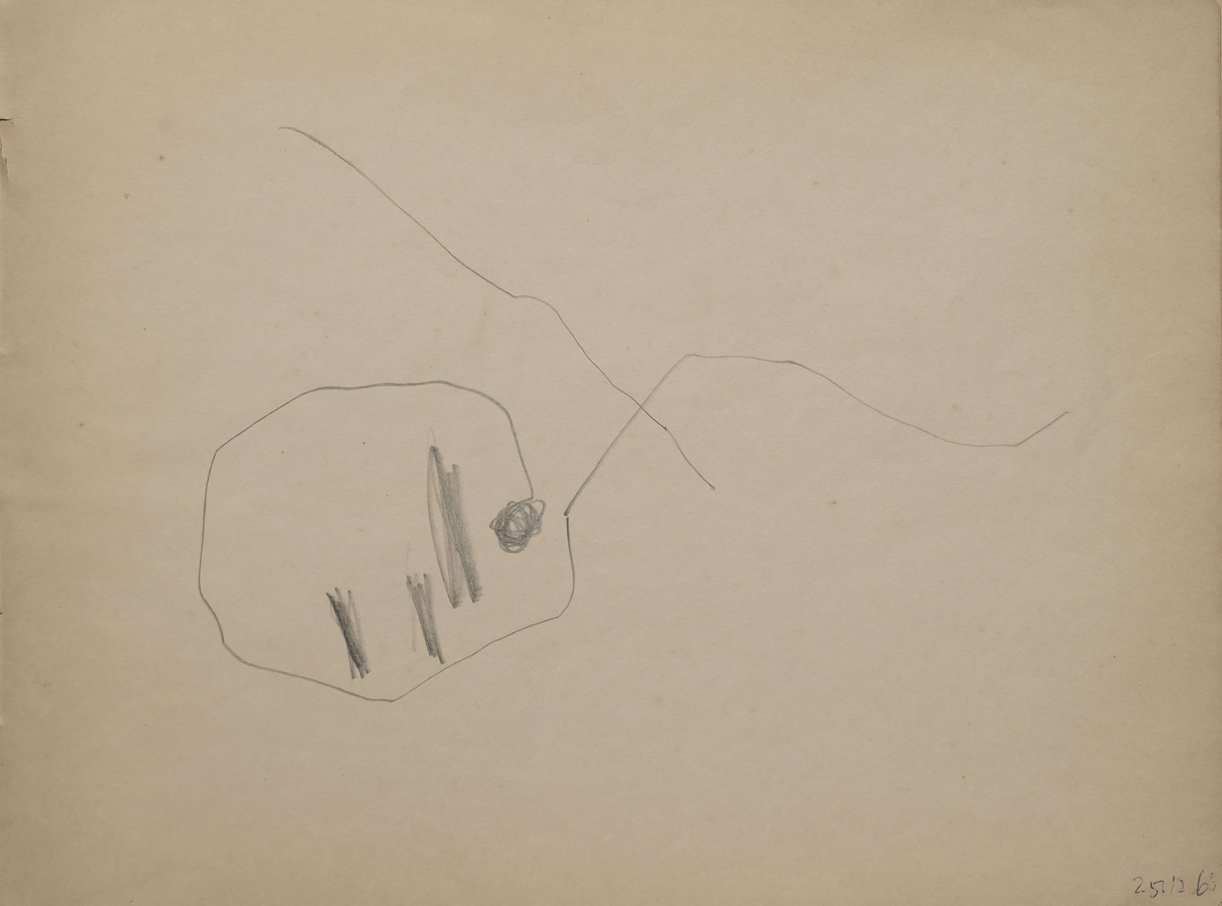 This piece feels like a quiet whisper of existence. The oval enclosing the dark strokes seems like a fragile enclosure—a boundary that barely holds together the scattered remnants inside. The little scribble rests like a wound or a knot, suggesting something unresolved. The single line escaping from the form feels like a thread reaching outward, searching for connection but crossing paths with emptiness. The vast blank space becomes as important as the marks, amplifying the sense of solitude. There’s a feeling of incompleteness, of something left unsaid—like a memory fading, but leaving behind the faintest traces of struggle and presence.