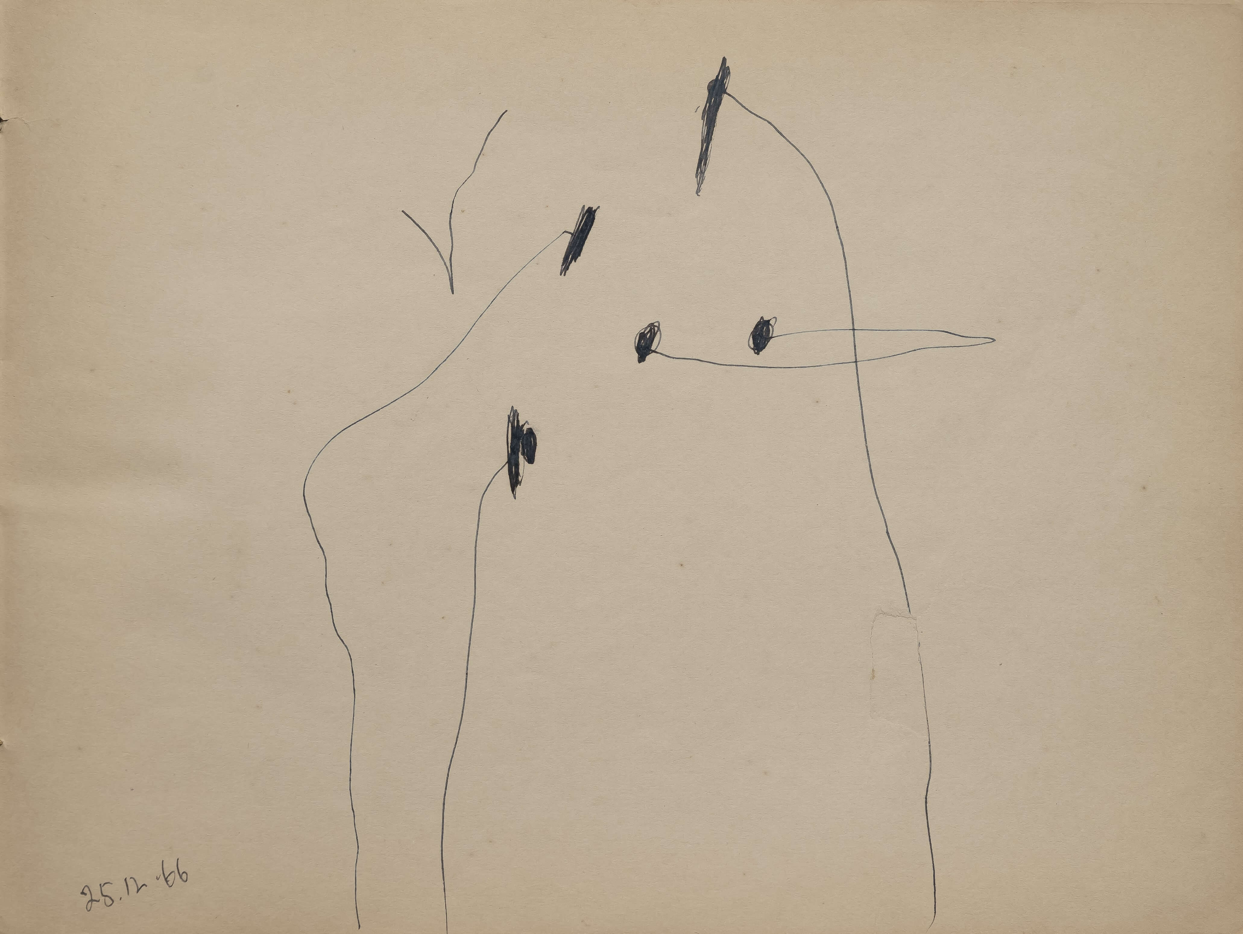 This drawing carries a haunting simplicity, as if capturing the ghost of a figure rather than the figure itself. The thin, uncertain lines feel fragile—like a memory on the verge of fading. The five dark patches act like anchors of intensity, evoking wounds, interrupting the fragility of the lines with sudden heaviness. The emptiness surrounding the marks deepens the sense of isolation, giving the impression of a presence that is both there and not there. It feels like a portrait of absence, a quiet reminder of how easily people, moments, and lives slip into silence.