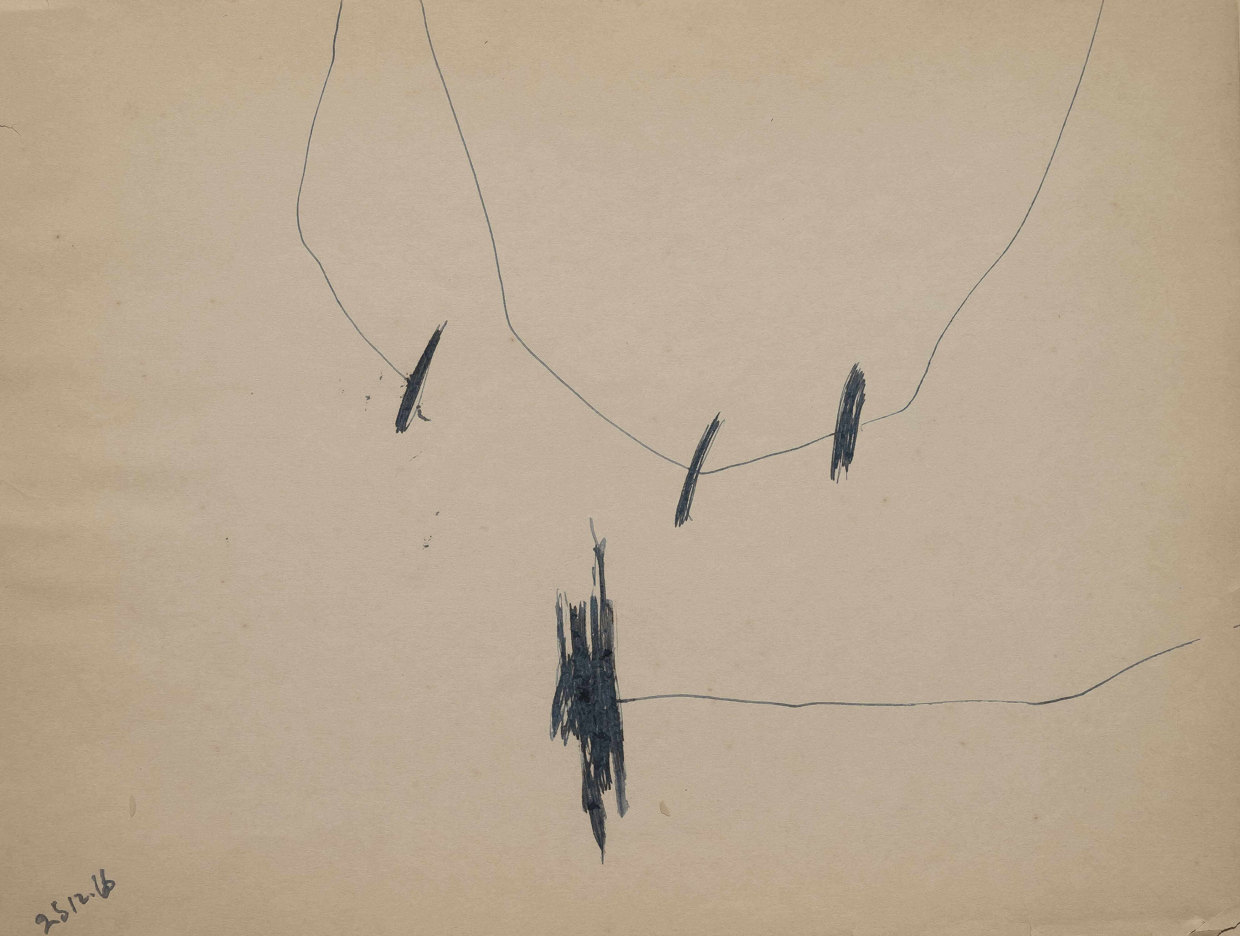 From Somnath Hore’s emotional lens, this work can be seen as an embodiment of silence, fragility, and scars left by human struggle. The sparse lines and dark strokes seem to carry a weight heavier than their form, echoing his lifelong engagement with famine, war, and suffering. The emptiness of the paper becomes as meaningful as the marks, suggesting absence, loss, and the quiet endurance of pain. Each broken stroke feels like a wound—raw, unresolved, yet deeply human. Hore often sought to capture not likeness but essence, and here the minimal gesture conveys vulnerability, loneliness, and resilience at once. It reflects his empathy toward the dispossessed, his ability to translate anguish into visual language without spectacle. What remains is not despair alone, but a muted dignity that rises from silence.