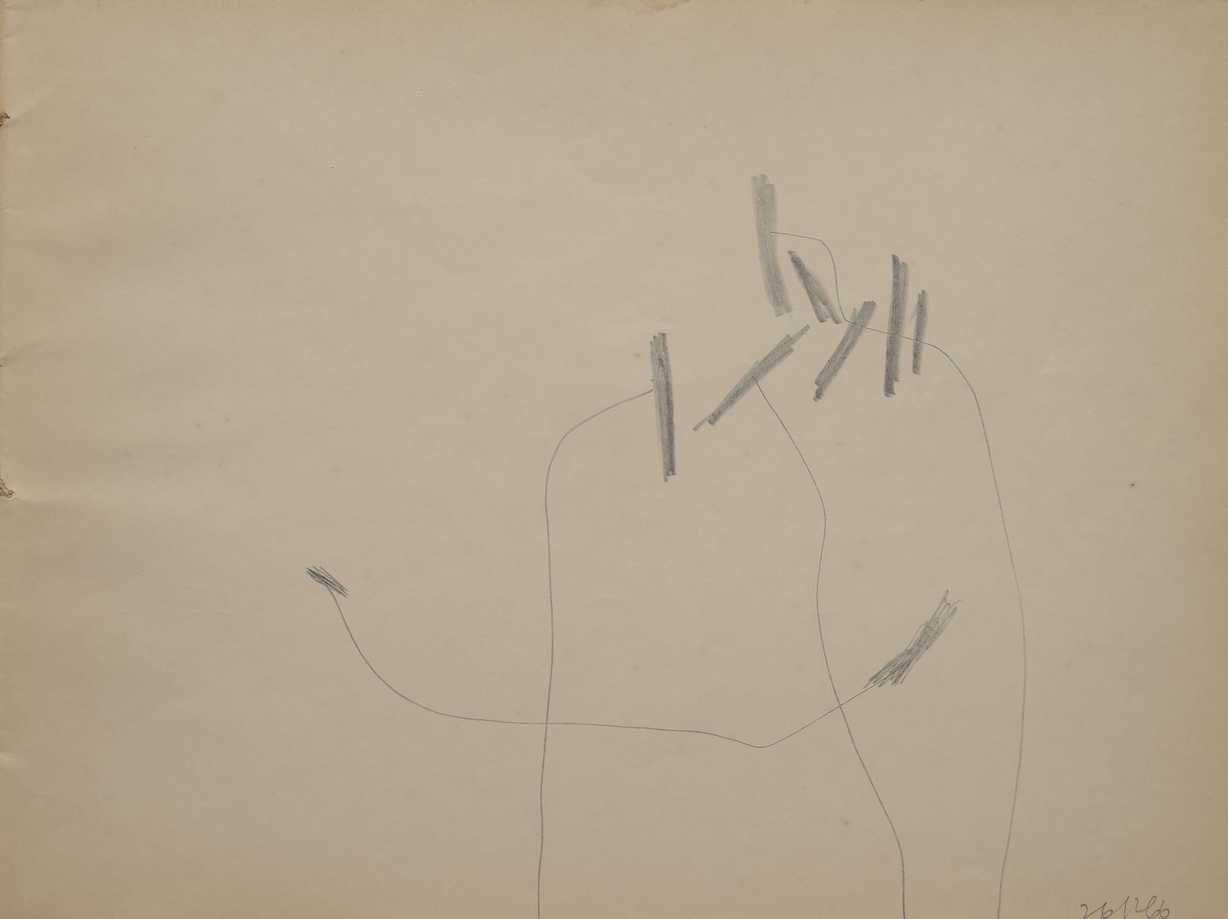 This image feels like the ghost of a body—fragile, hollow, and weighed down by its scars. The vertical shape stands upright yet vulnerable, its surface pierced by repeated dark marks that echo wounds or burdens carried. The thin, reaching line feels like an outstretched arm— searching, pleading, or perhaps surrendering to emptiness. The sparseness of the page intensifies the loneliness of the form, as if it exists in isolation against an overwhelming silence. Every shaded mark speaks of injury, but also of survival, of the body’s insistence on enduring despite its fragility. It is a portrait, not of the body’s strength, but of its quiet resilience.