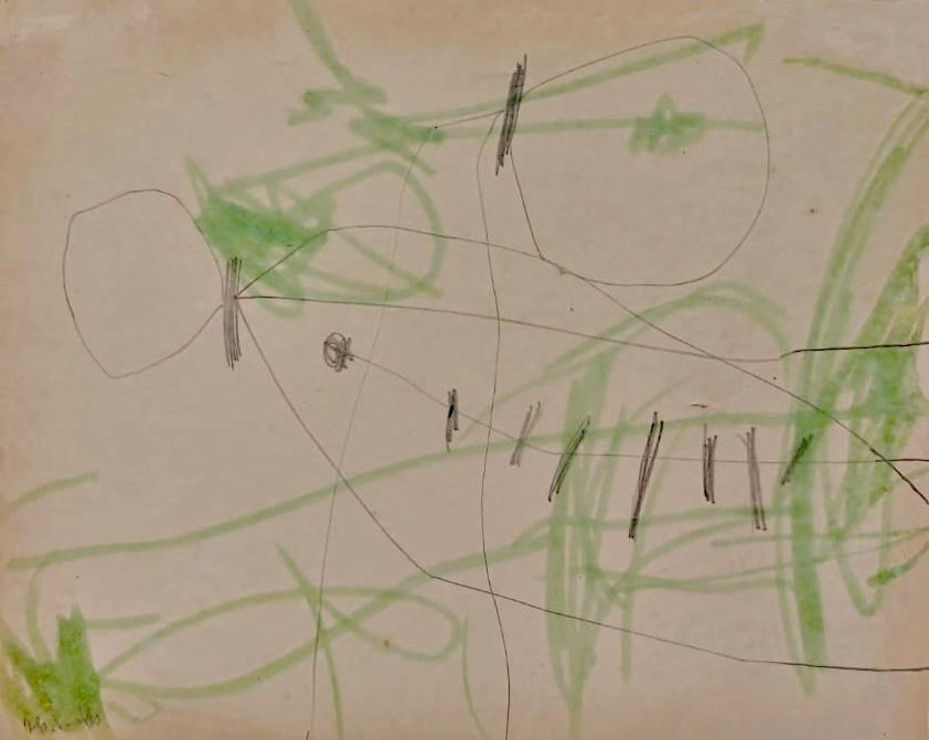 The painting feels vulnerable, almost childlike in its honesty. The scribbles carry a restless energy, yet the sparseness leaves behind a sense of emptiness. It gives an impression of fragility, pain, and memory — as though trying to capture something fleeting, wounded, or broken. The green introduces a faint breath of life, but it struggles against the starkness of the pencil marks.