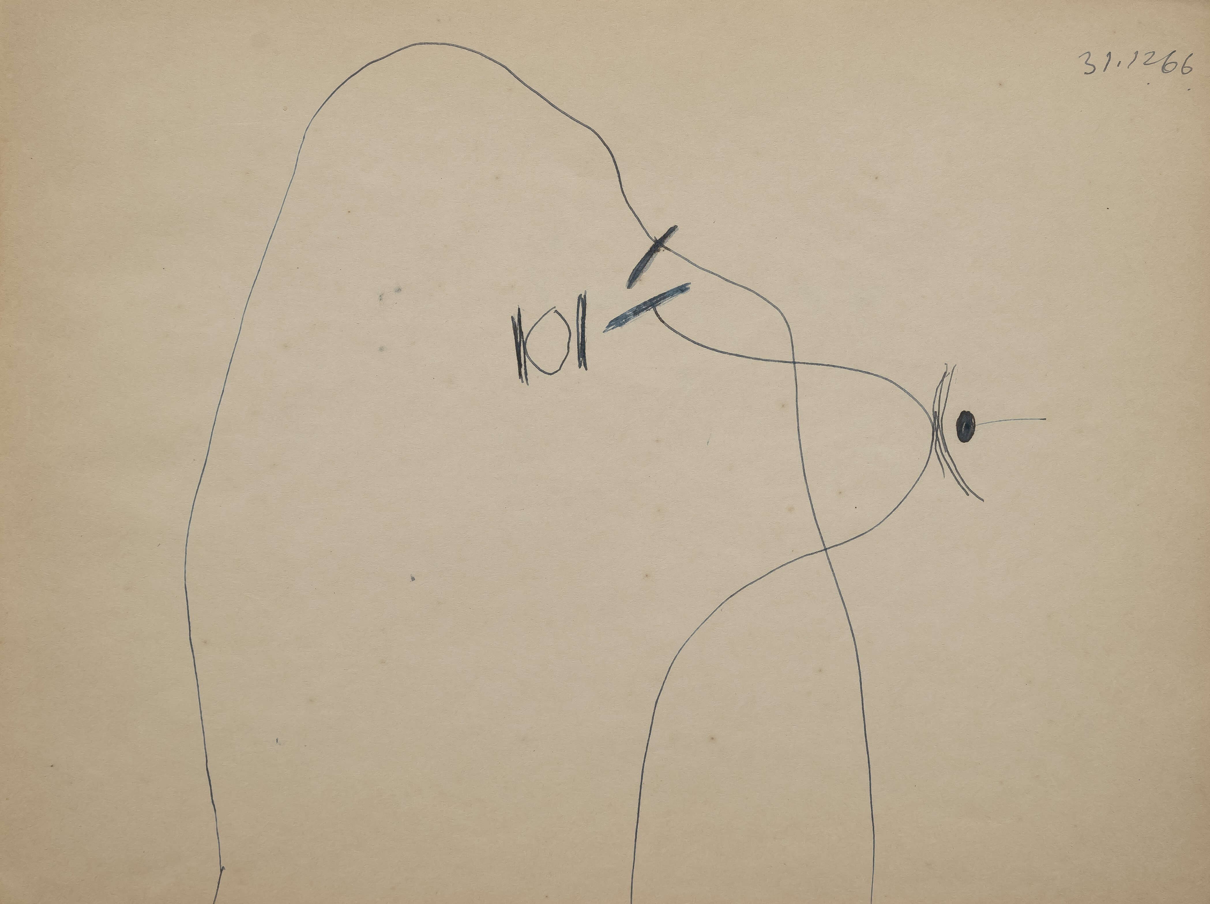 The drawing conveys restraint and fragility, as if the artist captured only the barest essence of a thought or figure. The minimal lines feel like whispers on the page, leaving much unsaid, yet suggesting an intimate, contemplative mood. The two oval forms evoke the idea of eyes or vision—watching, searching, or connecting across emptiness. The wide expanse of blank space around the sparse marks deepens the sense of isolation and vulnerability. It feels like a quiet meditation on presence and absence, or a fragile attempt at communication.