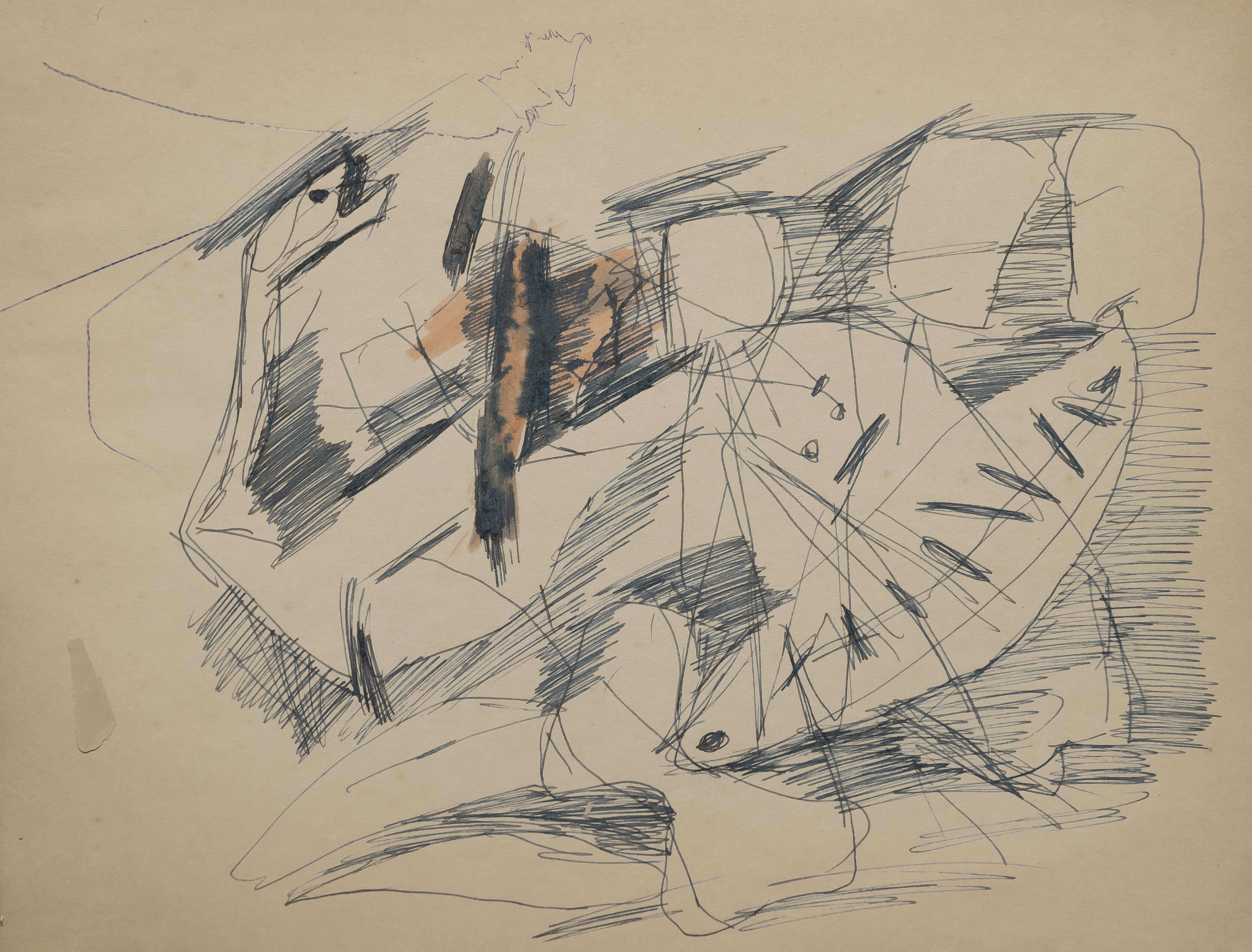 The piece radiates intensity and inner turbulence, with its sharp, overlapping lines creating a sense of chaos and urgency. The bold black strokes and sudden intrusion of earthy orange suggest conflict, passion, and perhaps even a wound that refuses to heal. There is both energy and unease in the composition, as if the artist is wrestling with thoughts too heavy to contain. The jagged, restless movements evoke frustration but also resilience—an insistence on expression despite fragmentation.