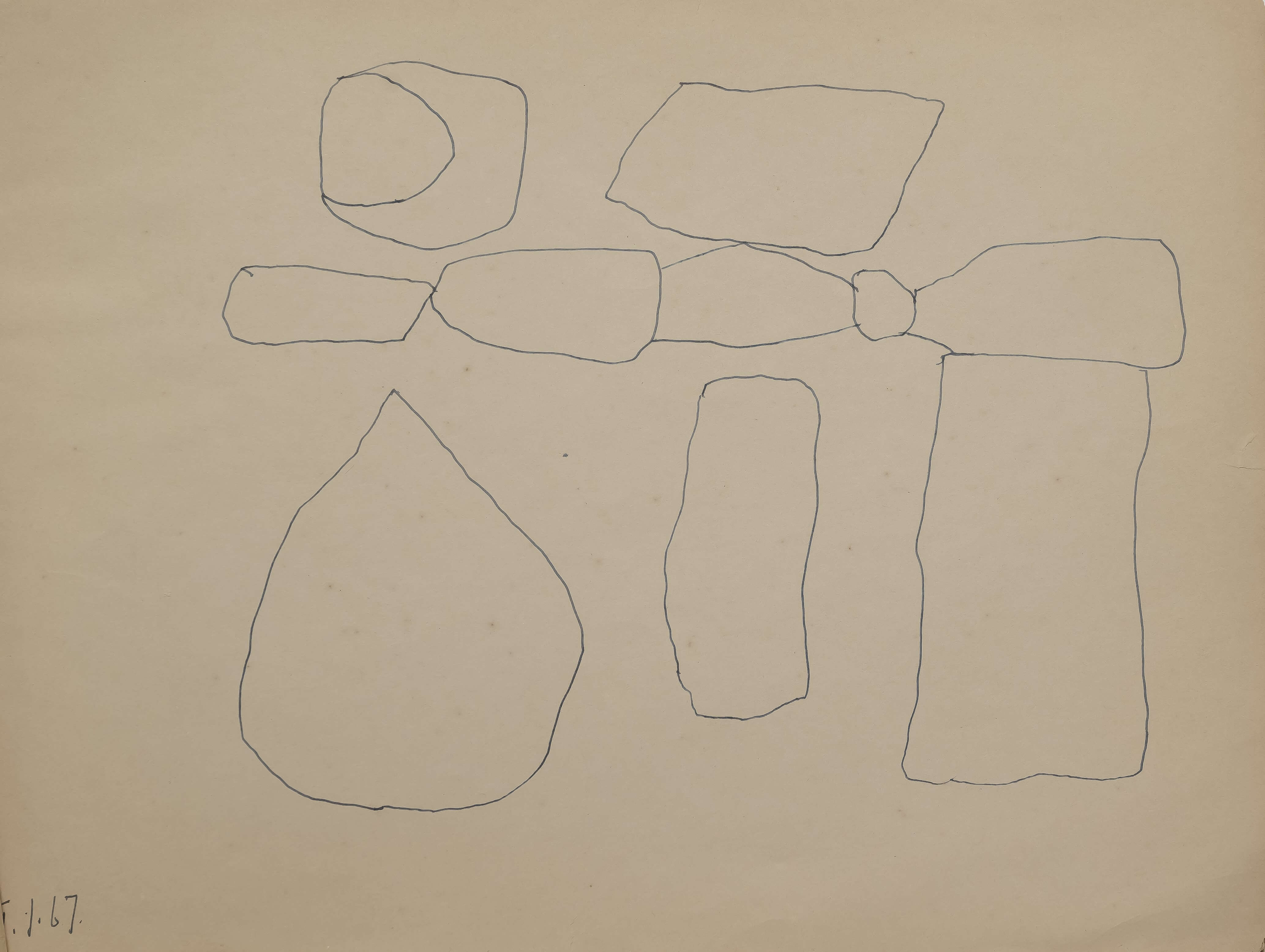 This drawing feels calmer, more deliberate, and almost meditative compared to the earlier ones. Instead of restless energy and scribbled bursts, the artist here chooses clarity—quiet outlines of simple, contained forms. There’s a sense of order emerging, a search for balance and structure. The teardrop, rectangles, and rounded shapes carry a childlike honesty, yet also suggest an attempt at symbolic language, like a visual alphabet. It feels less chaotic, more thoughtful—as if the artist is beginning to pause and reflect, shaping inner experience into recognisable, stable forms.