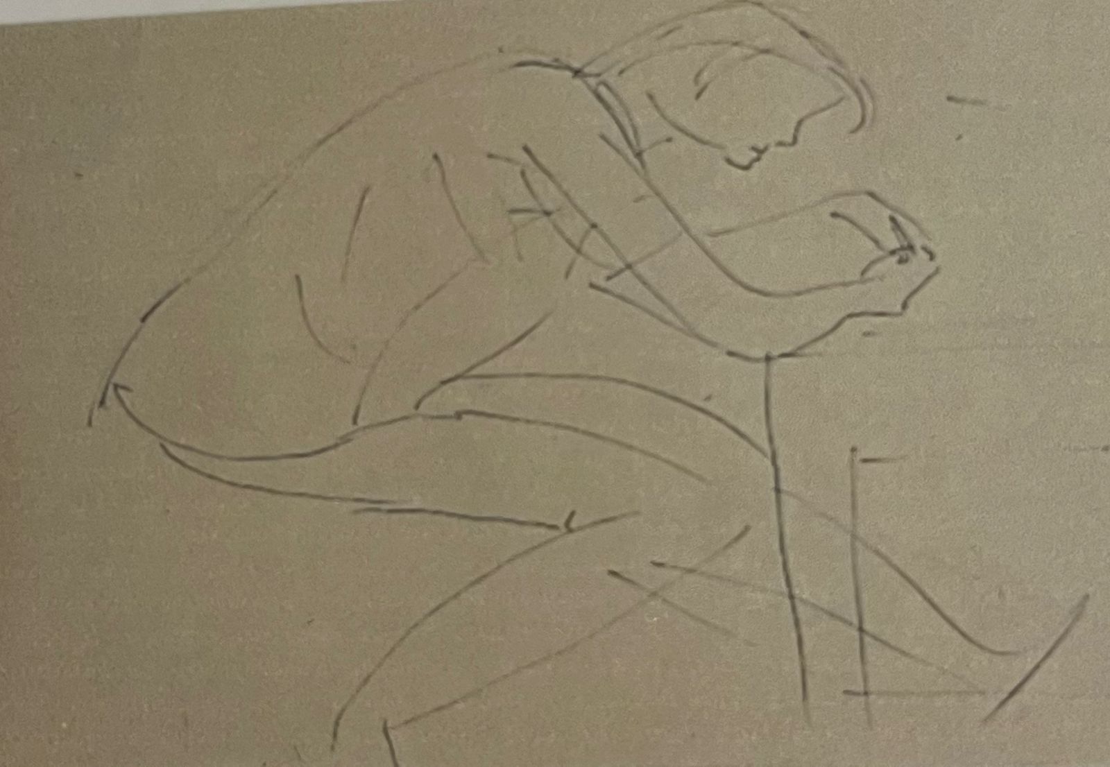 The drawing captures a moment of inwardness, as if the figure is folded into thought or absorbed in an unseen task. The bowed head and hunched posture evoke contemplation, fatigue, or quiet vulnerability. The loose, gestural strokes give the impression of fleeting observation — a sketch made quickly to seize the essence of a mood rather than physical detail. The sparseness of the lines leaves much to the imagination, allowingthe viewer to feel the weight of the figure’s inner world more than their outer appearance. The aged, worn paper adds a sense of memory and passage of time, enhancing the impression of a private, almost intimate scene caught in a brief moment.