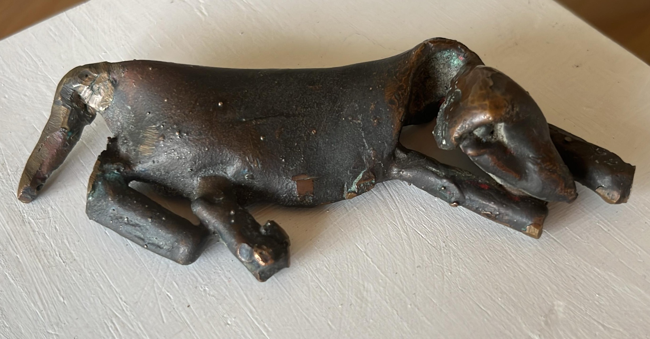 The dog portrays vulnerability and hopelessness. The lowered head and folded body speak of fatigue, hunger, and final abandonment — themes that echo through Somnath Hore’s lifelong concern with suffering of beings, whether human or animal. Yet, within this fragility lies dignity: the dog’s presence, though wounded and incomplete, commands empathy and recognition. Much like Hore’s Wounds Series, this sculpture transforms a simple figure into a universal metaphor for pain, survival, and silent resilience. It becomes not just a dog, but a symbol of all neglected lives enduring in silence.