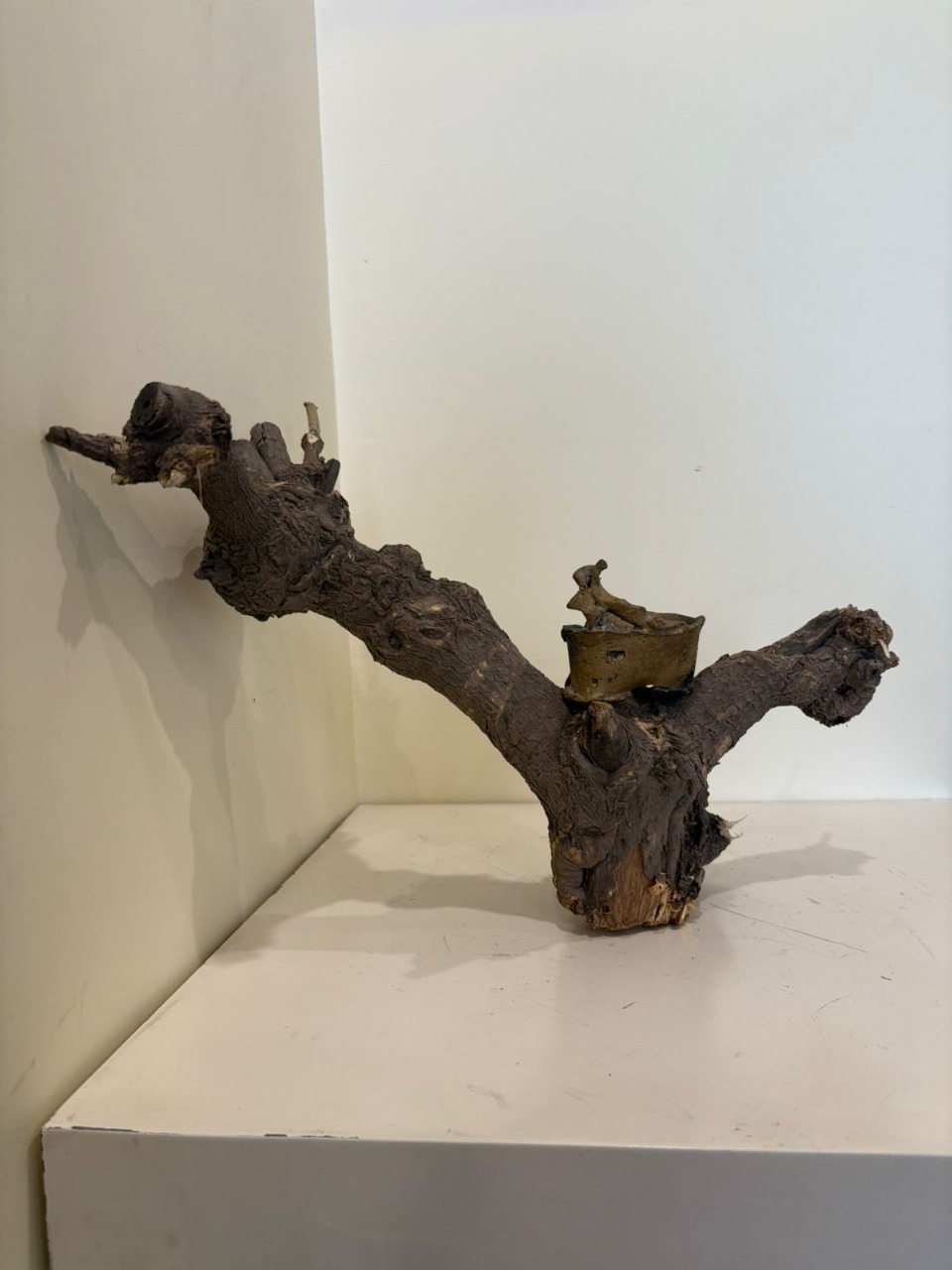 The sculpture radiates tenderness and resilience. The “bird in the nest” imagery evokes a sense of shelter amidst harshness — a fragile life held by a scarred, weathered branch. In the spirit of Somnath Hore, this becomes a metaphor for human struggle. Even in an environment marked by wounds and hardship, there exists the instinct to nurture, to protect, to carry forward life. The piece feels like a quiet pause — a symbol of fragile hope resting within the embrace of endurance. Just as Hore’s drawings give voice to suffering humanity, here the nest becomes a sanctuary, a reminder that care and survival coexist even in the harshest conditions.
